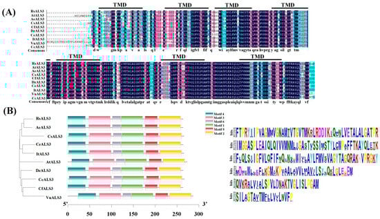 Sequence conservation and motif analysis of RsALS3. (A) Multiple sequence alignment of RsALS3 with ALS3 homologs from related plant species. (B) Distribution of conserved protein motifs identified by MEME analysis in RsALS3 and orthologs. Motifs are represented by colored boxes.