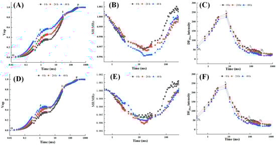 Chlorophyll fluorescence kinetics in response to Al stress. Changes in (A,D) prompt fluorescence (OJIP transients), (B,E) modulated reflection at 820 nm (MR820nm), and (C,F) delayed fluorescence (DF) kinetics in WT (Upper panels) and OE-RsALS3 (Lower panels) plants after 48 h of 0.5 mM AlCl3 treatment.