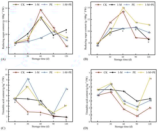 The alterations in RS among various treatment groups throughout the prolonged storage duration are illustrated in Figure 5A,B. As storage duration increased, the RS of each group initially rose and subsequently declined, aligning with the results reported by Sun et al. [33]. In the sugar-cored part, the RS of the 1-M group was markedly elevated compared to the other three treatment groups at 30 d of storage, while the RS of the CK group was significantly greater than that of the other three treatment groups at 60 d of storage. Subsequently, the RS decreased rapidly in the CK group. The RS of the CK group was markedly lower than that of the other three treatment groups at 120 d of storage. At 120 d storage, the RS were ranked as follows: 1-M group > 1-M+PE group > PE group > CK group. The application of 1-MCP treatment effectively preserves the RS in the sugar-cored part during the later stages of storage. In the non-sugar-cored part, the RS of the CK group was considerably elevated compared to the other treatment groups at the 60 d storage period. Following a storage duration of 60 d, the RS diminished swiftly, reaching a concentration of 8.70 g·100 g−1 FW after 120 d of storage. At the 120 d storage part, the RS were ranked as follows: 1-M+PE group > PE group > CK group > 1-M group. The 1-MCP+PE treatment efficiently maintains the RS in the non-sugar-cored part during the late storage phase. Variations in TA among various treatment groups throughout prolonged storage duration are illustrated in Figure 5C,D. In the sugar-cored part, the contents of the PE and 1-M+PE groups exhibited a pattern of increase, decrease, and subsequent increase relative to the CK group, while the TA of the PE and 1-M+PE groups was considerably elevated compared to the CK group at 120 d of storage. In the non-sugar-cored part, the CK, 1-M, and PE groups exhibited analogous patterns; however, the 1-M+PE group had a considerable increase in TA from 90 to 120 d of storage, with the final TA significantly surpassing that of the other groups. In conclusion, the TA of all treatment groups exceeded that of the control group after 120 d of storage. The PE treatment mitigated the reduction of TA in the sugar-cored part, while the 1-MCP, PE, and 1-MCP+PE treatments inhibited the decline of TA in the non-sugar-cored part, consistent with the findings of Park et al. [34].