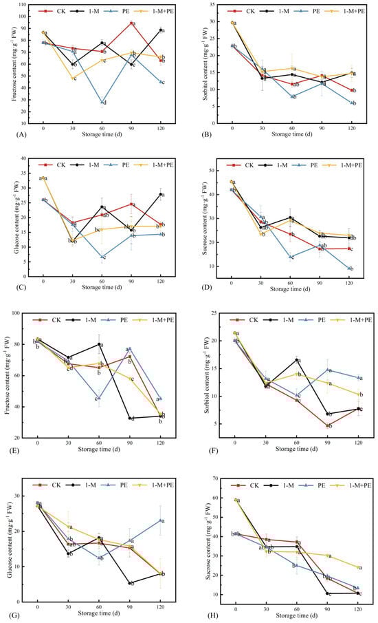 Changes in fructose (A), sorbitol (B), glucose (C), and sucrose (D) content in the sugar-cored part during storage. Changes in fructose (E), sorbitol (F), glucose (G), and sucrose (H) content in the non-sugar-cored part during storage. Different lowercase letters indicate significant differences among samples at the same time point (p < 0.05). Error bars represent the standard deviation of the mean. n = 3.