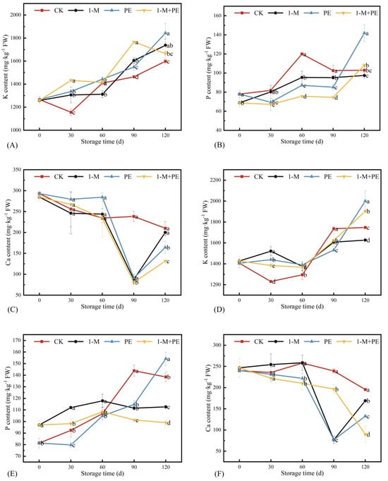 Changes in K (A), P (B), and Ca (C) content in the sugar-cored part during storage. Changes in K (D), P (E), and Ca (F) content in non-sugar-cored part during storage. Different lowercase letters indicate significant differences among samples at the same time point (p < 0.05). Error bars represent the standard deviation of the mean. n = 3.
