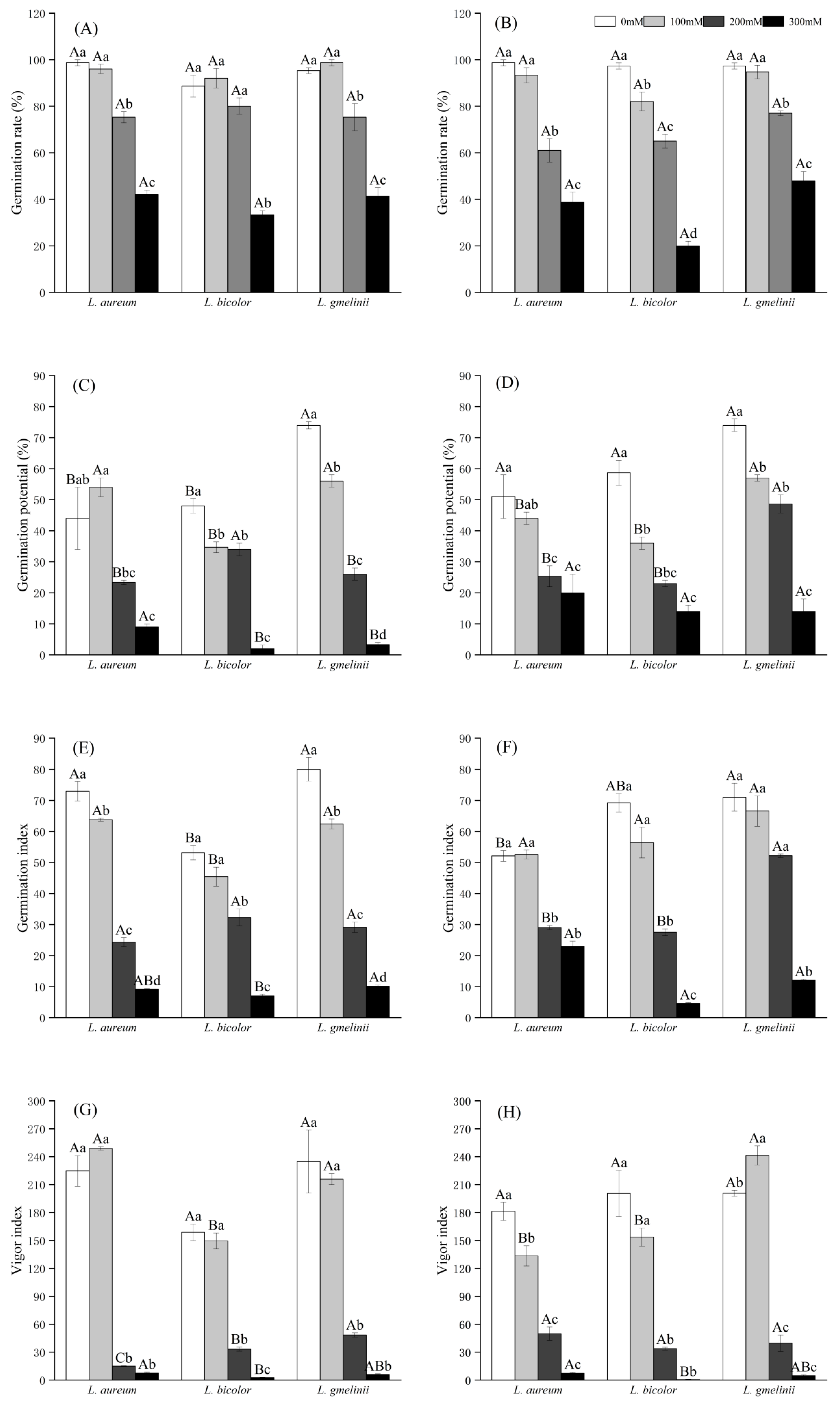 | NaCl 300 | 0.37 ± 0.04 Ab | 0.21 ± 0.01 Bc | 0.38 ± 0.04 Ab | |