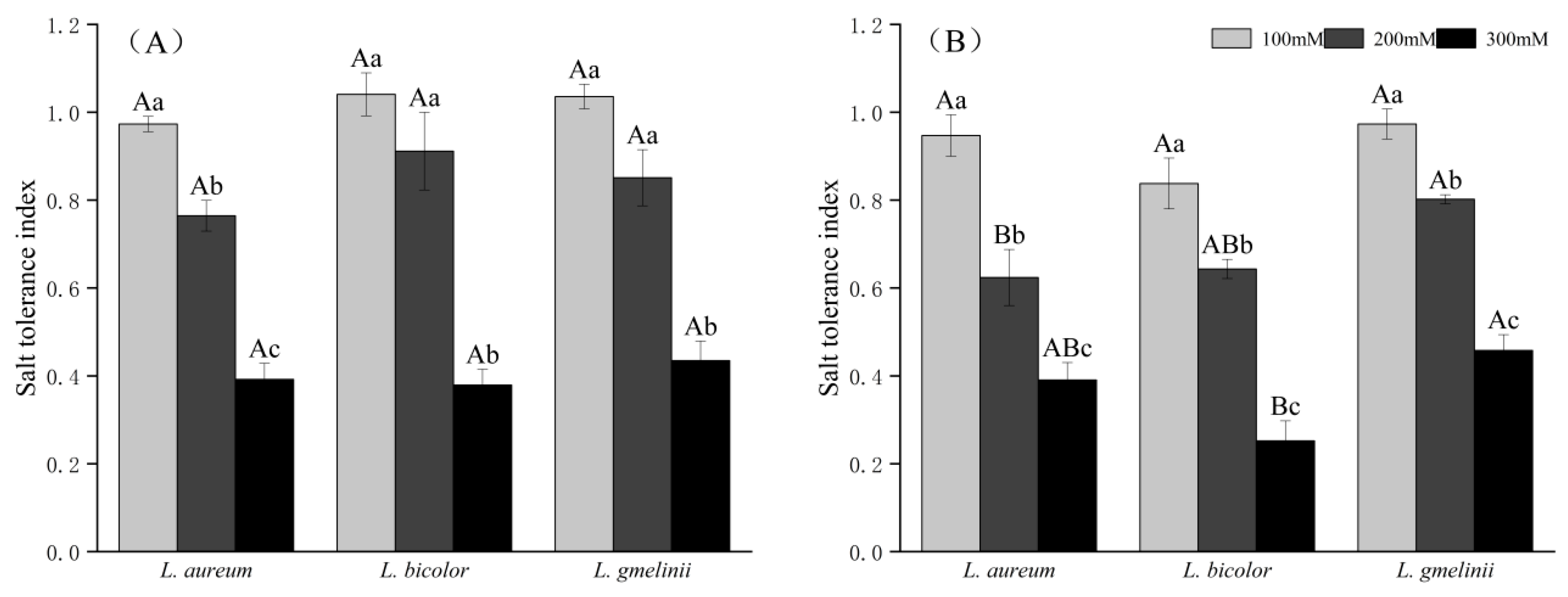 | NaCl 300 | 0.46 ± 0.04 Ab | 0.27 ± 0.01 Bc | 0.49 ± 0.04 Ab | |