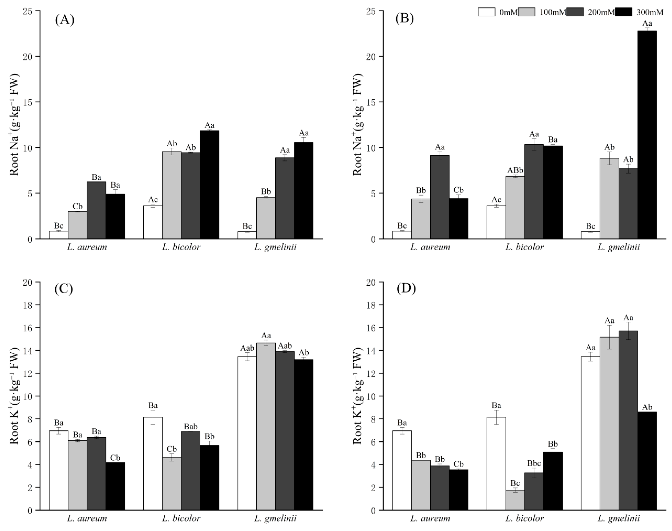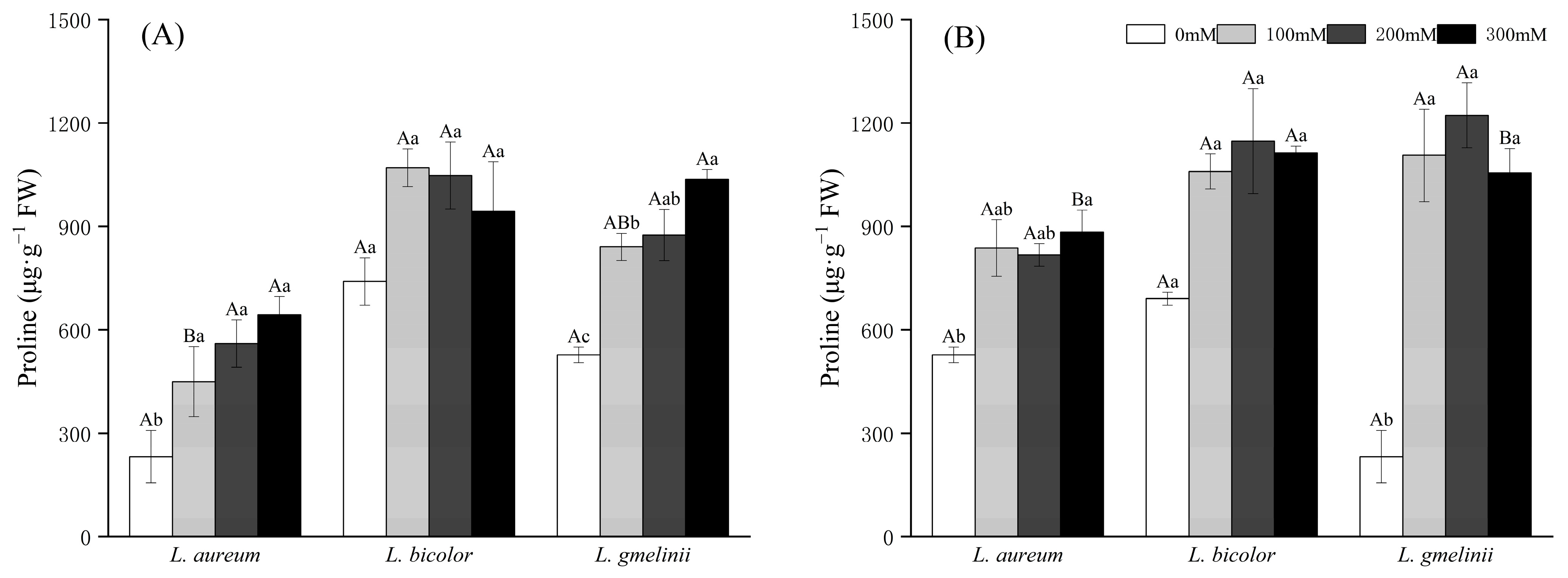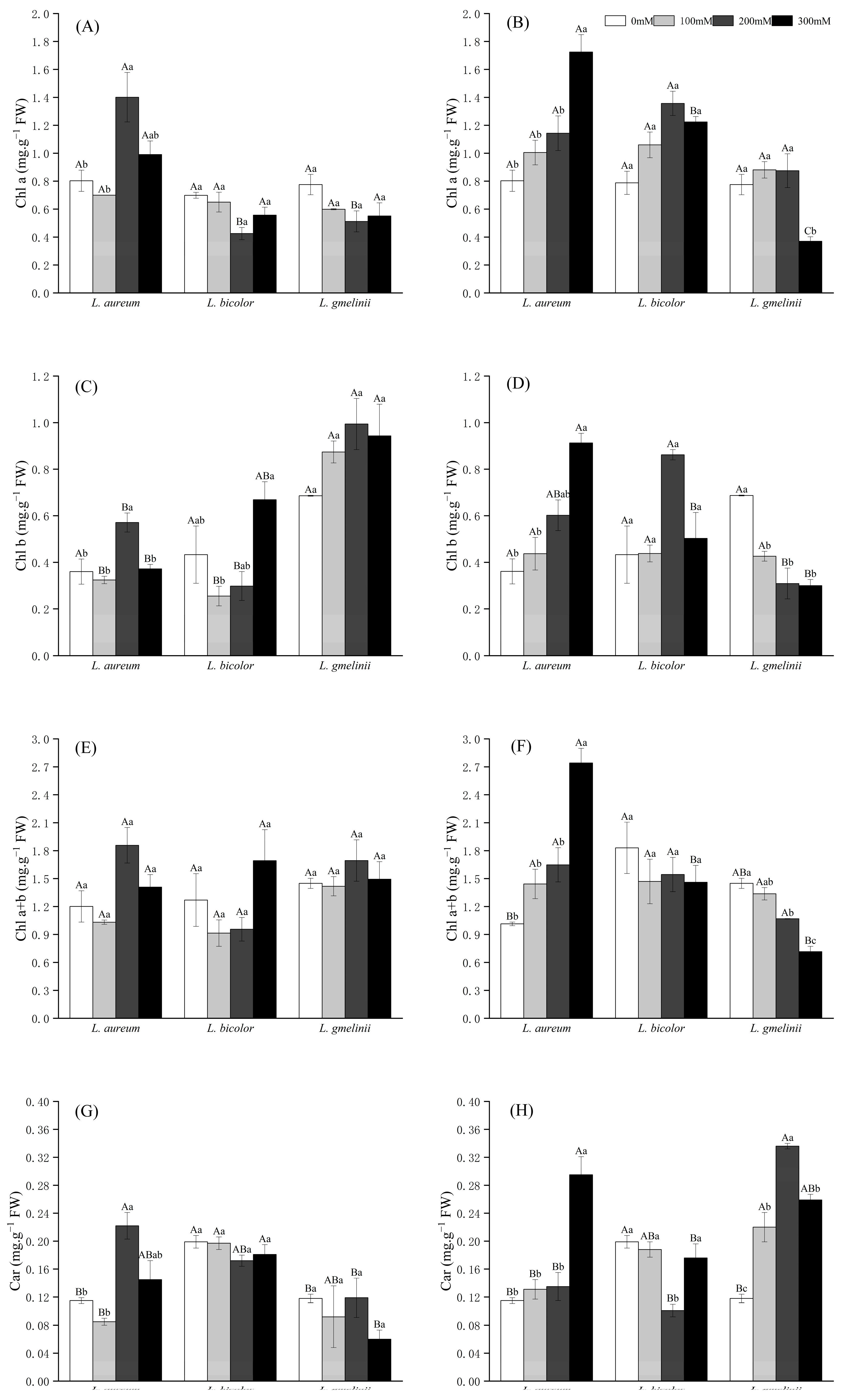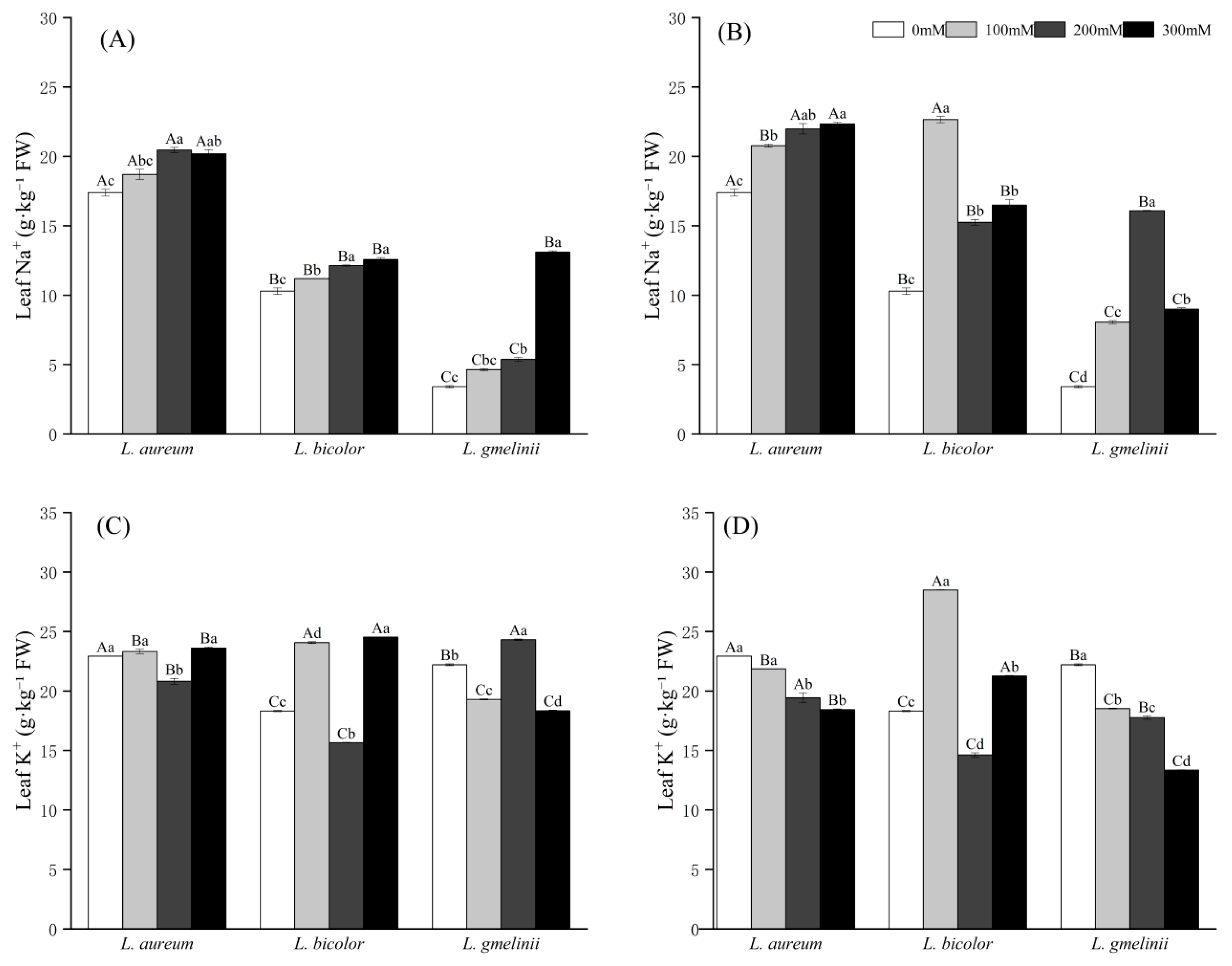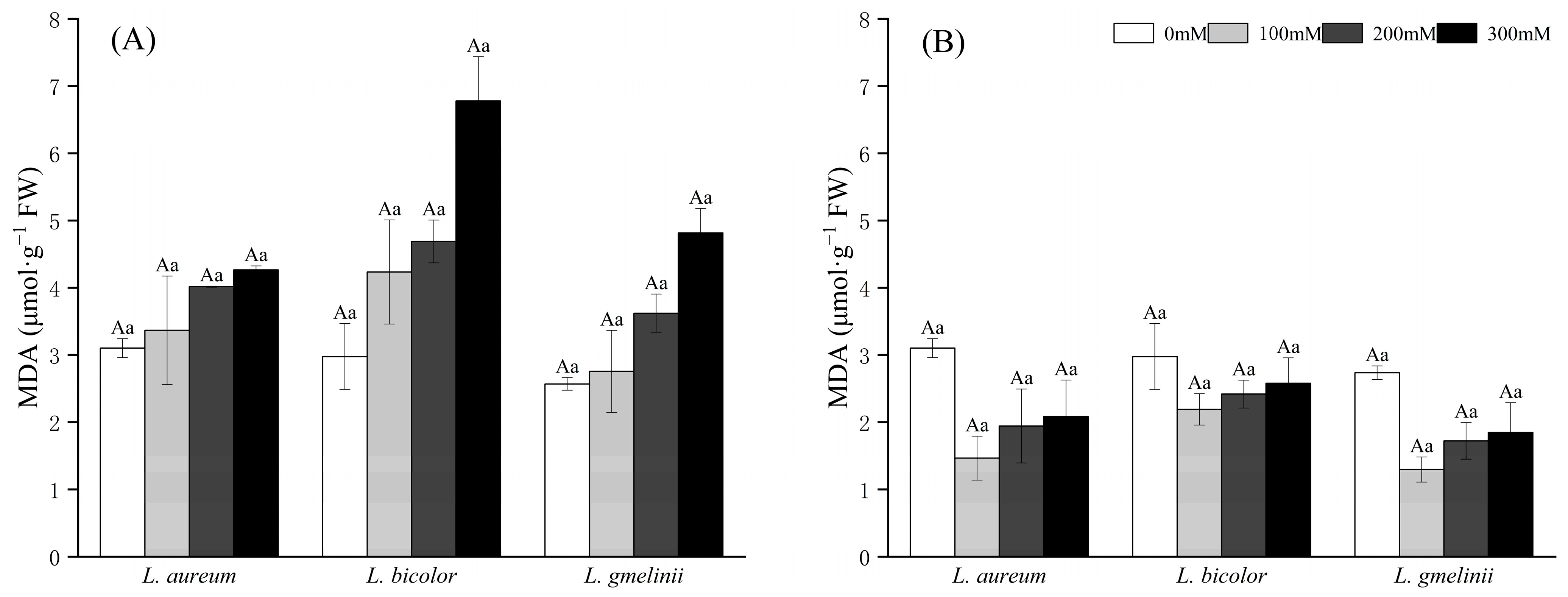 | NaCl 300 | 0.09 ± 0.01 ABa | 0.06 ± 0.01 Ba | 0.10 ± 0.01 Ab | |