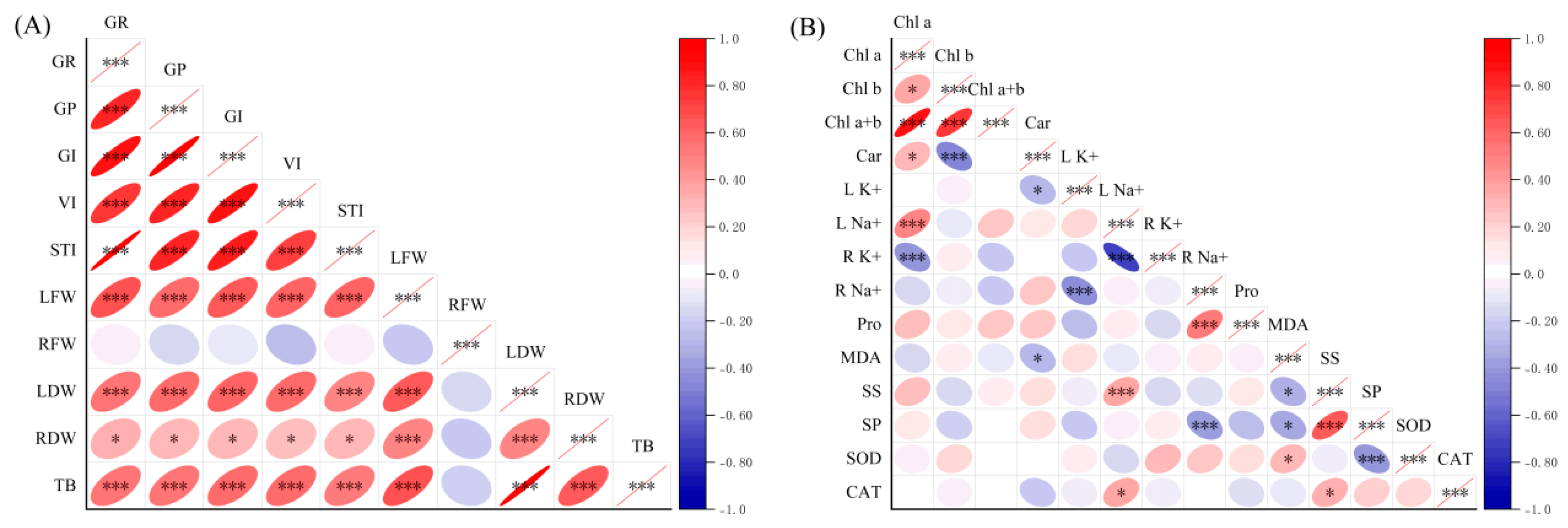 3.2.7. Correlation Analysis of NaCl and NaHCO3 Stresses on Germination, Growth, and Physiological–Biochemical Parameters