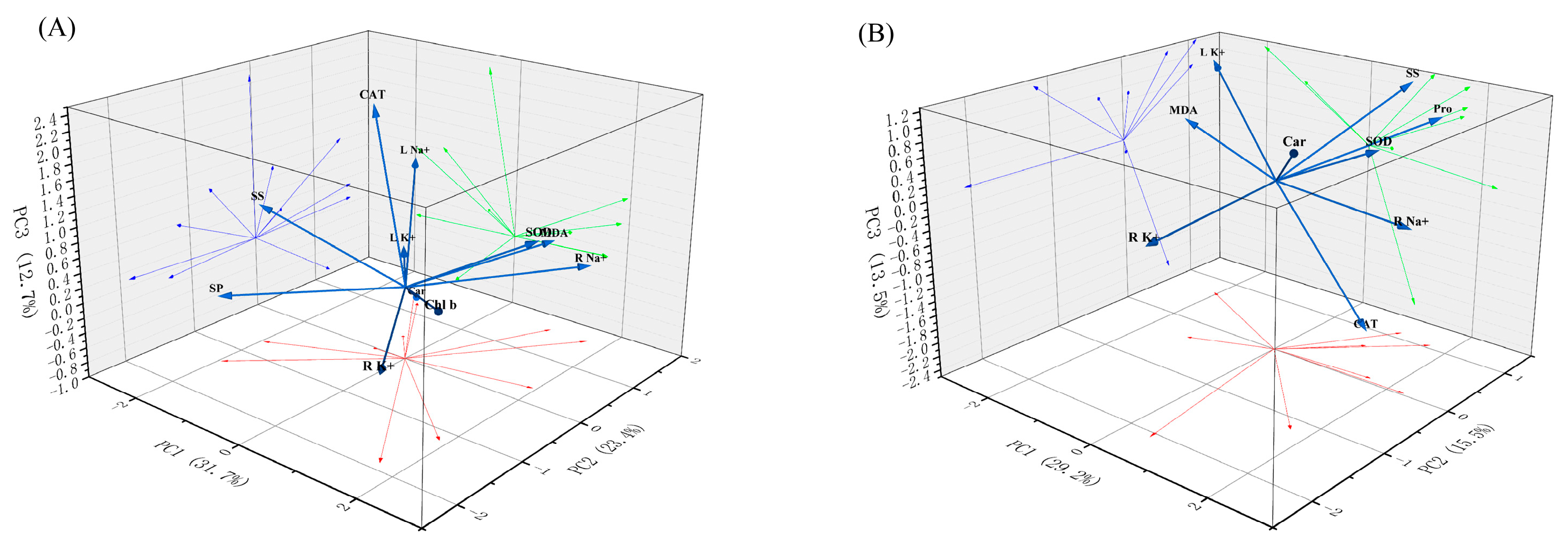 3.2.8. Principal Component Analysis of NaCl and NaHCO3 Stresses on Biochemical Parameters