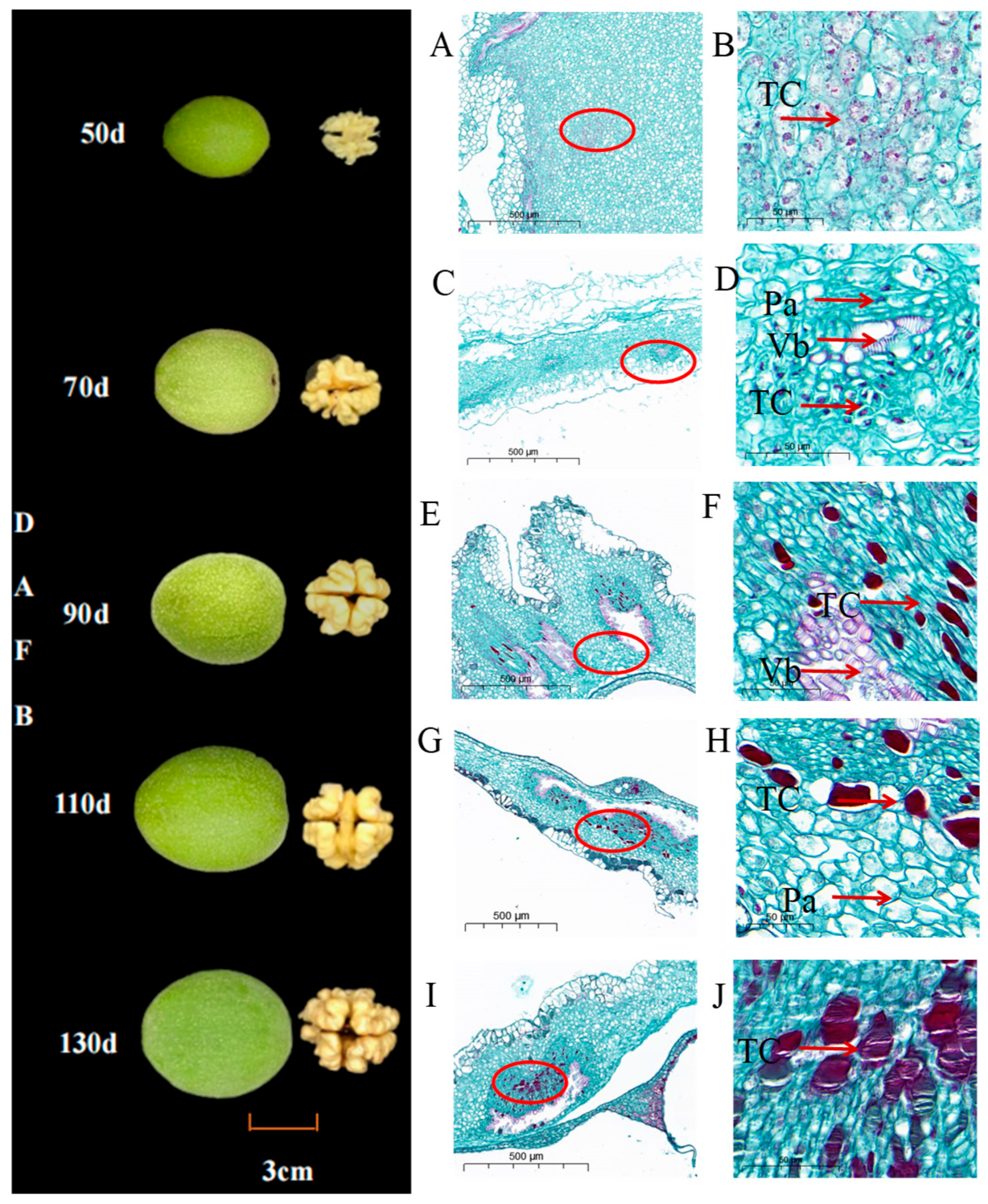 17], while systematic research on the dynamic morphological changes in tannin cells in walnut inner seed coats remains relatively limited.