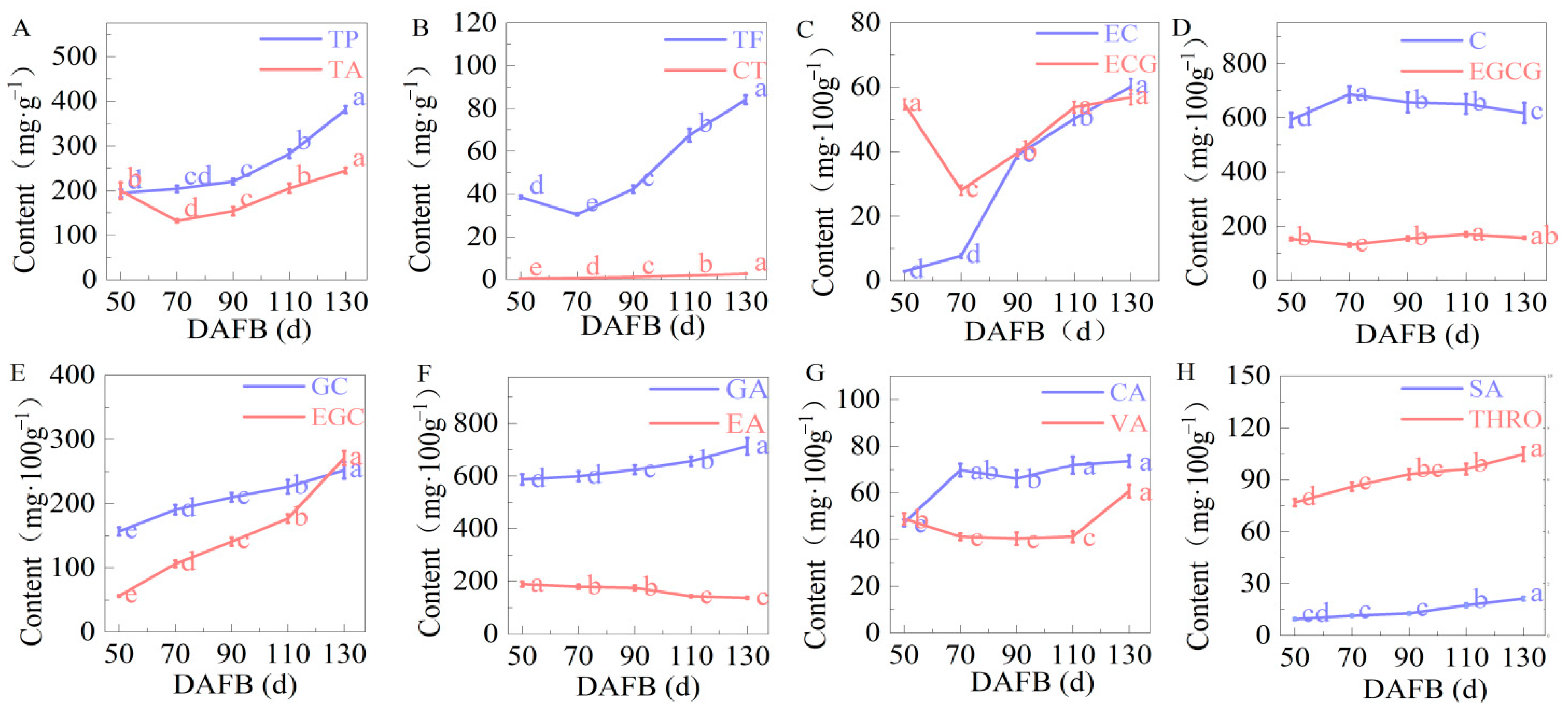 39]. However, total flavonoids and chlorogenic acid showed an initial decrease followed by an increase, while catechin (C) exhibited an initial increase followed by a decrease, differing from the patterns observed in ‘Qianhe 7’. This discrepancy may stem from varietal characteristics and cultivation environment differences. Additionally, Jin et al. [