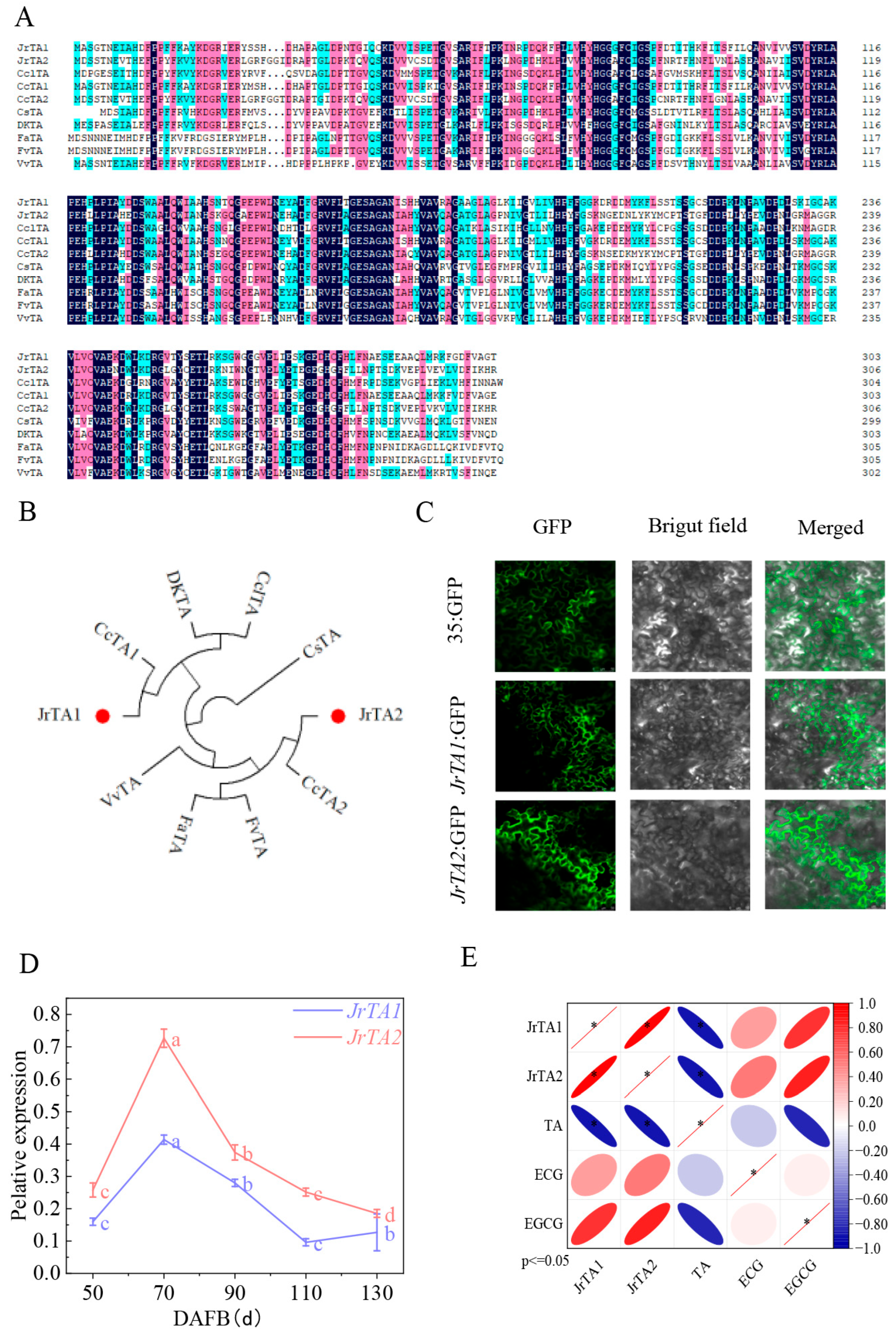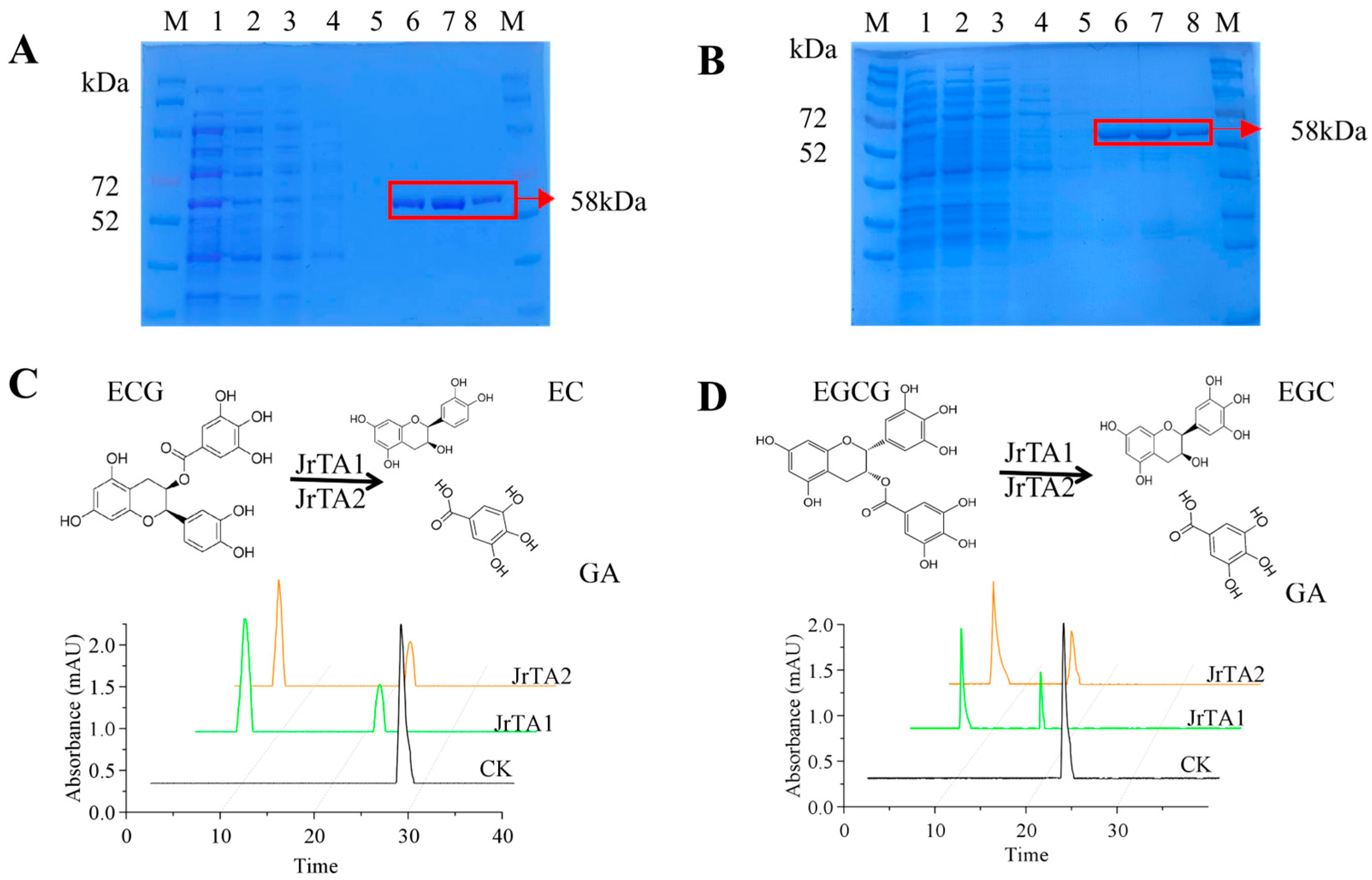 JrTA2 and obtained purified recombinant proteins through prokaryotic expression. In vitro enzyme activity analysis confirmed that both can specifically hydrolyze esterified catechins such as ECG and EGCG, consistent with the findings of Dai et al. [