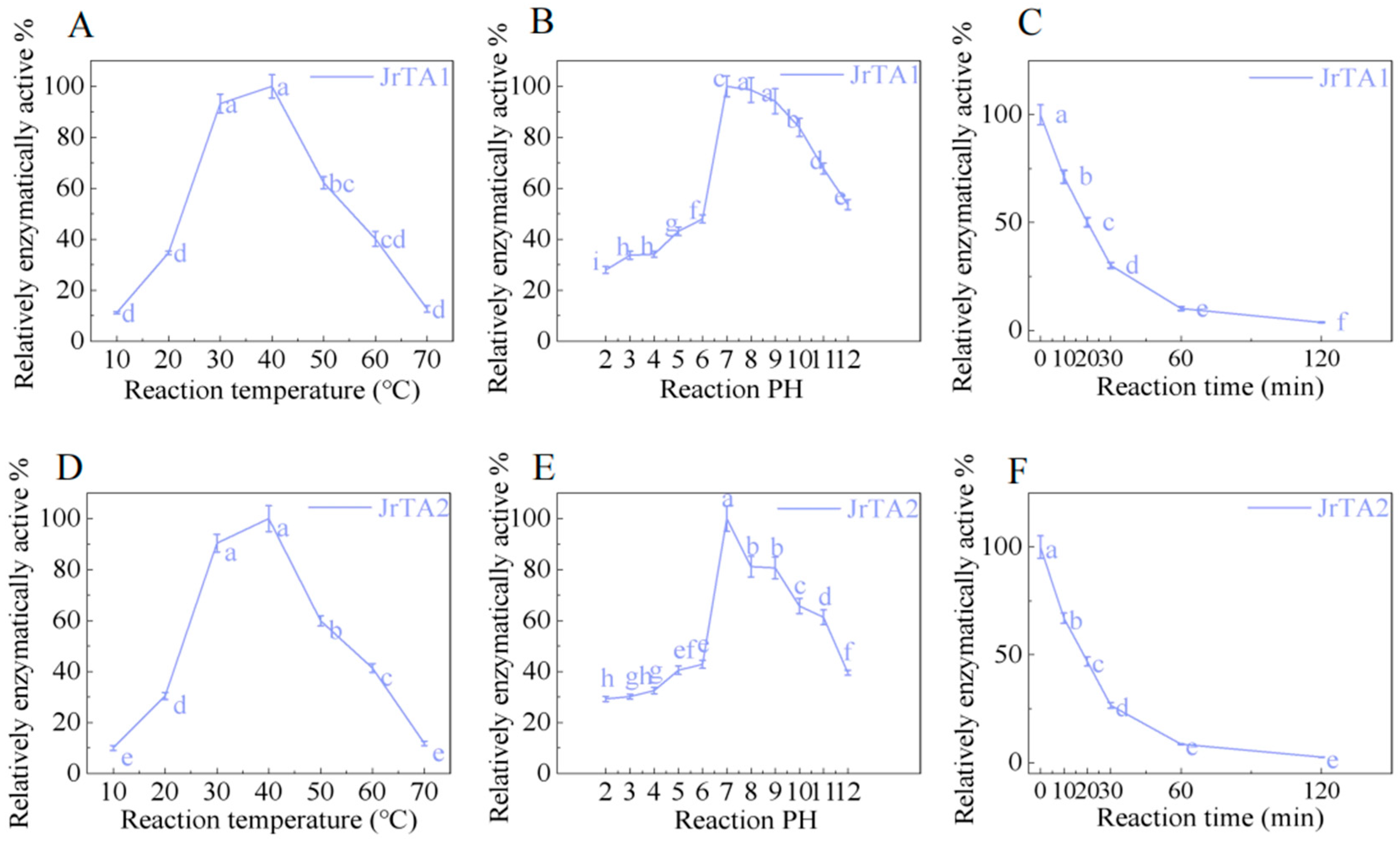 2.9. Determination of Enzymatic Properties of JrTAs Recombinant Enzyme