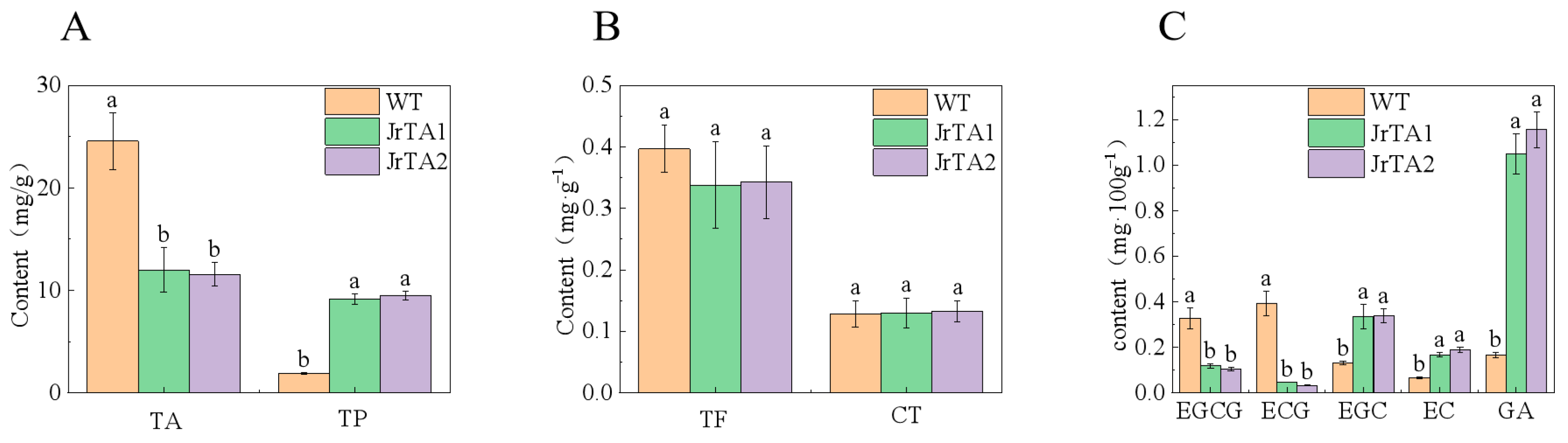 Arabidopsis, the contents of EGCG and ECG decreased, while the levels of EGC, EC, and GA increased, further validating that JrTA1 and JrTA2 specifically hydrolyze ester bonds in tannins and esterified catechins. This study found that the expression levels of