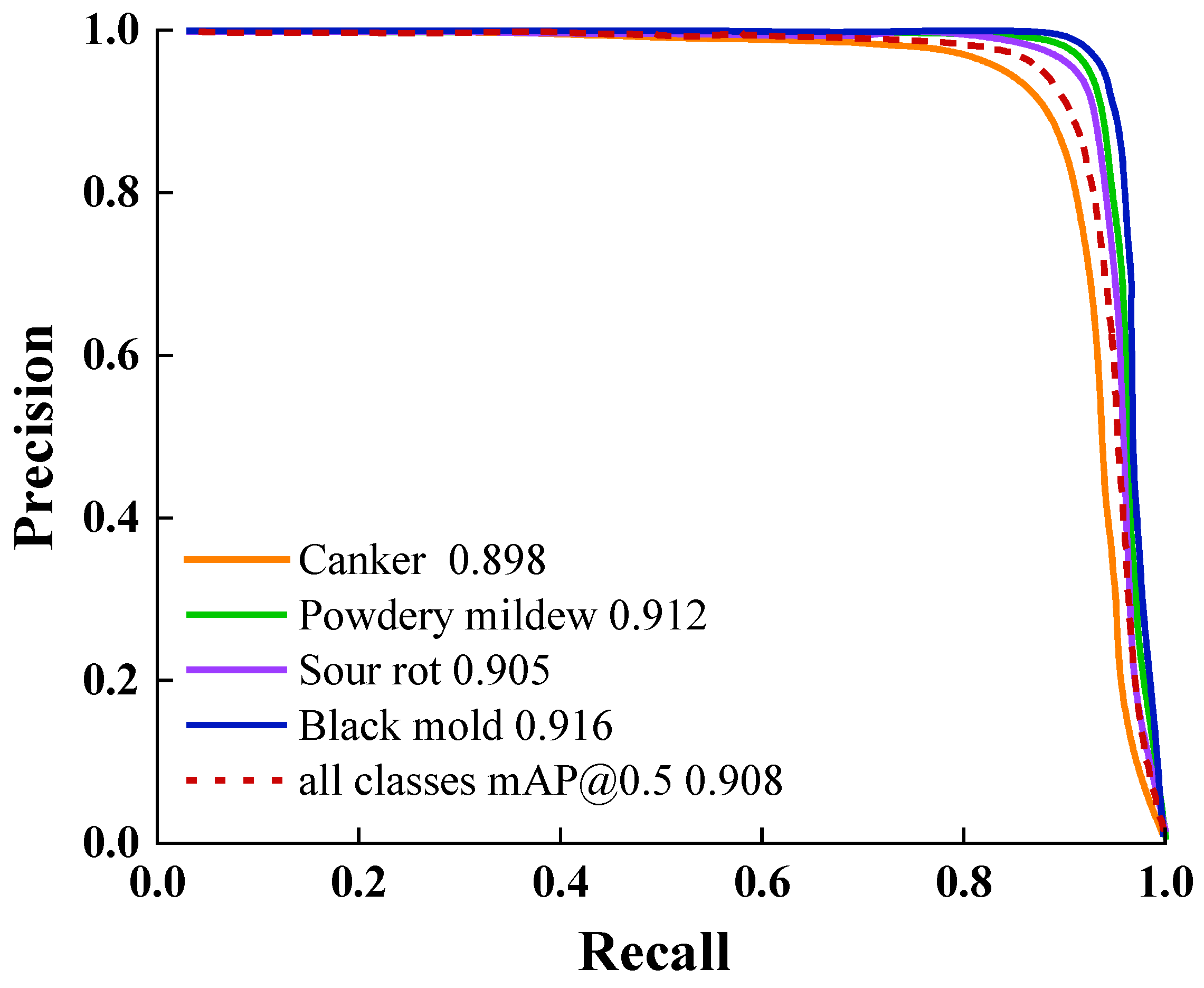 In post-harvest processing, integrating GBDR-Net into automated sorting systems can effectively overcome the cost and accuracy limitations associated with heavy reliance on manual grading. With a precision of 93.4%, the model significantly reduces the misclassification of healthy fruits, while its 89.6% recall rate ensures that the vast majority of infected fruits are accurately identified and removed. This capability not only enhances end-product quality directly but also holds substantial practical significance for establishing a reliable quality control barrier at the upstream supply chain level and strengthening end-consumer trust.