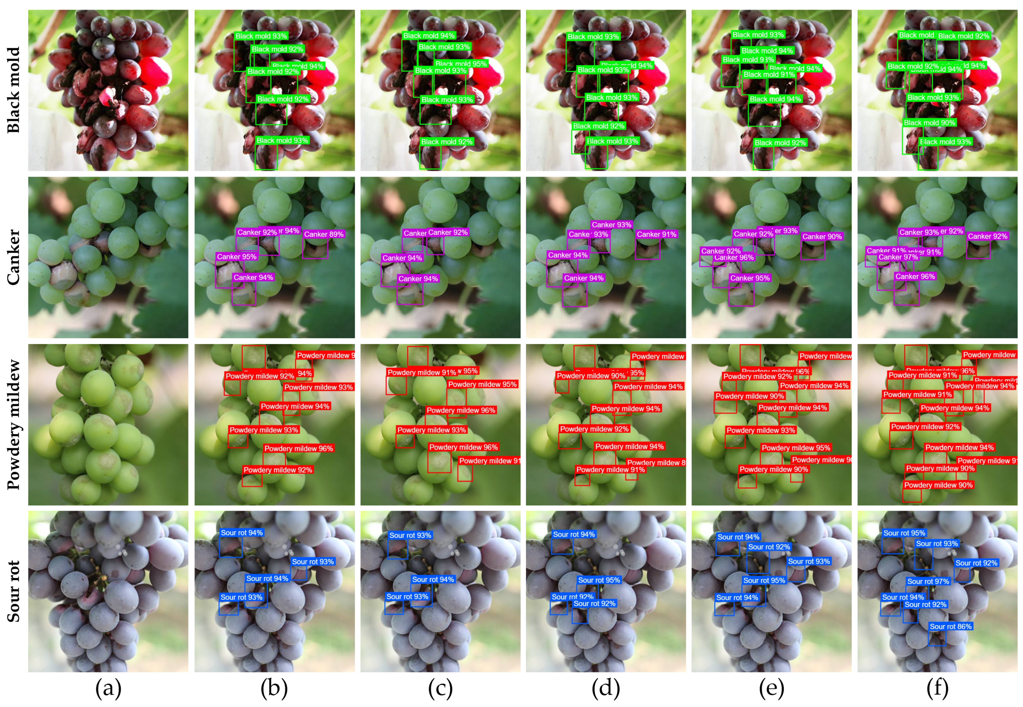 9]. The introduction of machine learning has significantly improved disease diagnosis through computer vision and image processing techniques. However, conventional methods often depend on handcrafted feature extraction algorithms, which typically exhibit limited generalization and poor robustness when identifying multiple diseases under complex field conditions. In practical scenarios characterized by overlapping berries, varying lesion sizes, and uneven illumination, these methods are prone to missed detections and false positives, thereby hindering the widespread application of computer vision in large-scale, automated harvest sorting [