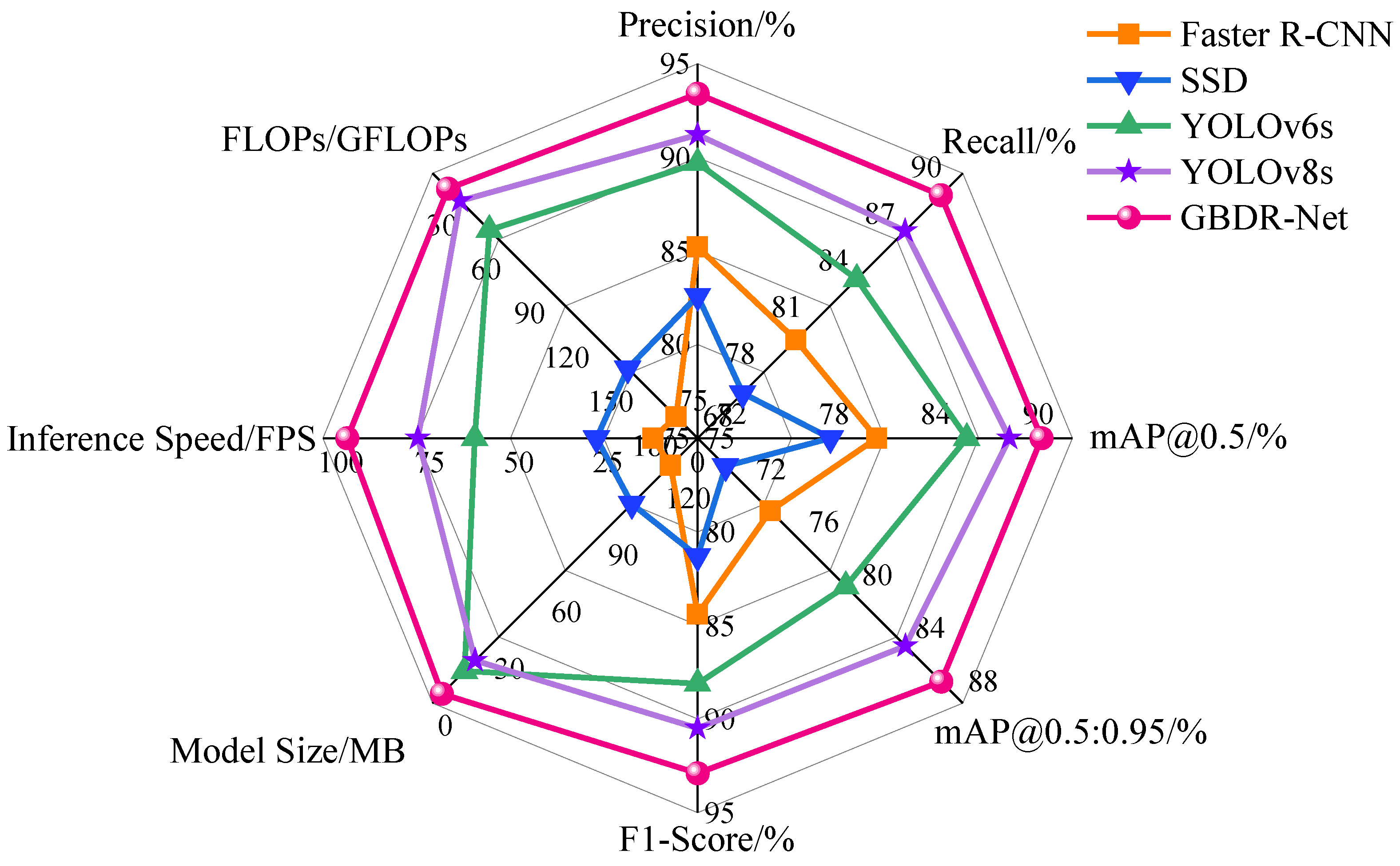 Comprehensive evaluation experiments demonstrate that GBDR-Net model has reached the state-of-the-art level in key performance metrics. On the GBDVA dataset, it achieved a precision of 93.4%, a recall of 89.6%, and an mAP@0.5 of 90.2%—not only significantly outperforming traditional models (e.g., Faster R-CNN, SSD) but also comprehensively surpassing advanced contemporary models (e.g., YOLOv6s, YOLOv8s). Notably, with a model size of only 4.83 MB and a computational cost of 20.5 GFLOPs, the model achieves a real-time inference speed of 98.2 FPS. This marks its optimal balance across the three critical dimensions of accuracy, speed, and lightweightedness, laying a foundation for large-scale deployment on embedded devices and mobile terminals.