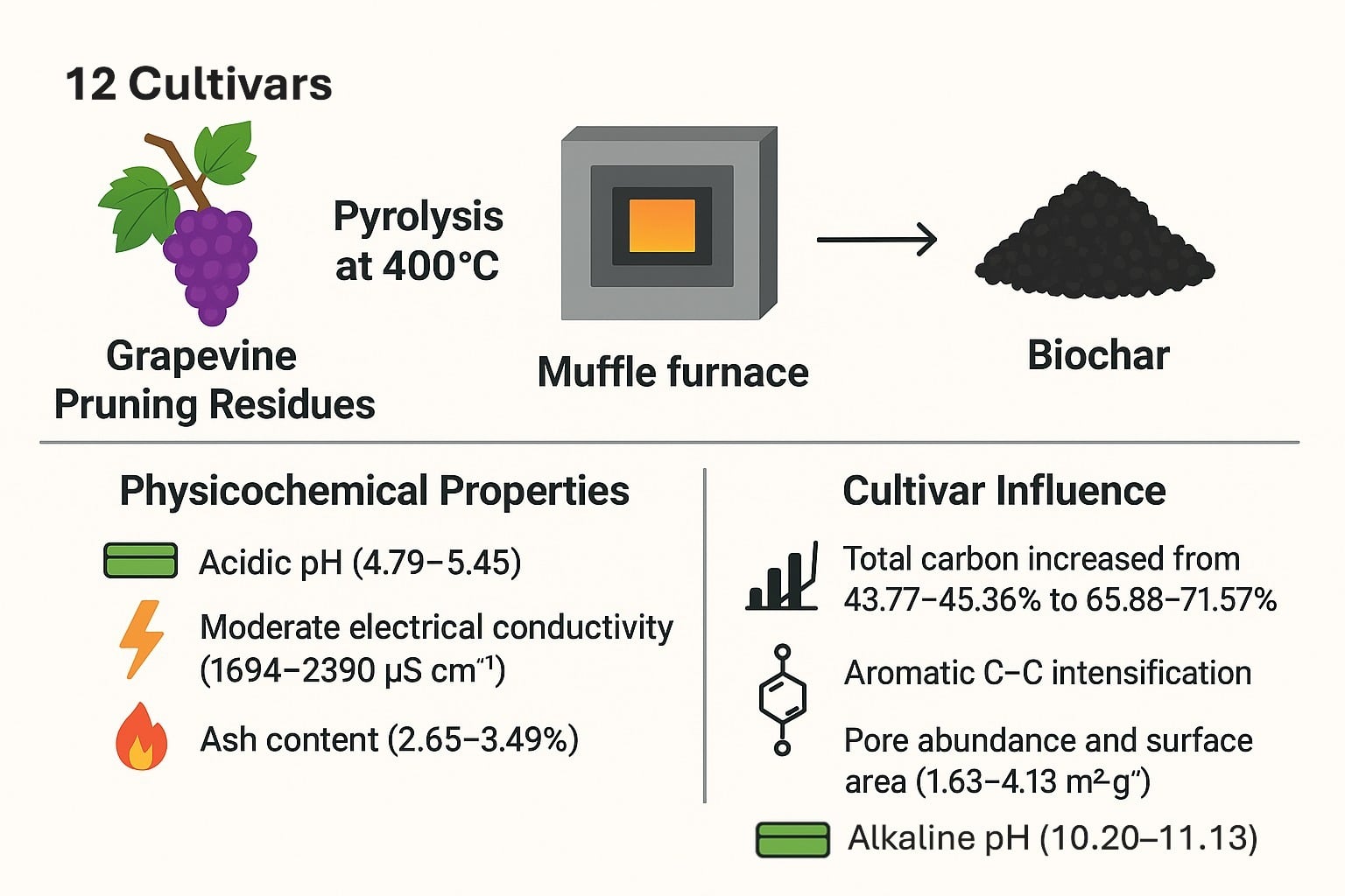 Cvitan D, Anđelini D, Prelac M, Javed Q, Užila Z, Pasković I, Major N, Černe M, Goreta Ban S, Bubola M, et al. Physicochemical Properties of Biochar Produced from Grapevine-Pruning Residues of 12 Cultivars. Horticulturae. 2026; 12(1):4. https://doi.org/10.3390/horticulturae12010004