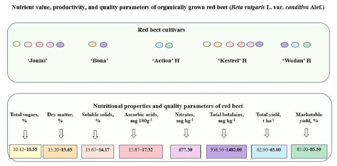 Karklelienė R, Radzevičius A, Viškelis P, Vaštakaitė-Kairienė V, Juškevičienė D. Nutrient Value, Productivity, and Quality Parameters of Organically Grown Red Beet (Beta vulgaris L. var. conditiva Alef.). Horticulturae. 2026; 12(1):55. https://doi.org/10.3390/horticulturae12010055