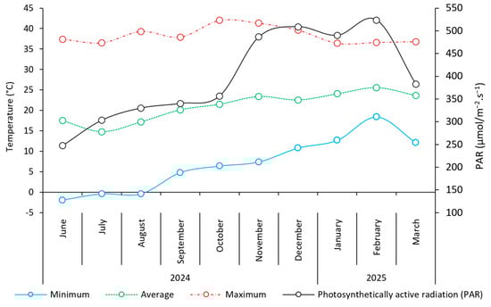 Irrigation was performed using an automated dripper system (flow rate of 1.4 L·h−1 per dripper). Nutrient solutions were applied weekly, with a 50% reduction in phosphorus [9]. Air temperature (minimum, average, and maximum) and photosynthetically active radiation (PAR) inside the greenhouse were monitored throughout the experiment (Figure 3).