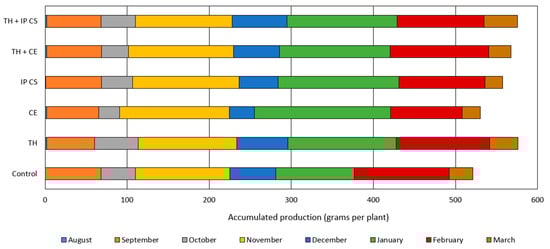 Monthly strawberry yield of cv. ‘San Andreas’ grown without and with biostimulants. TH: Trichoderma harzianum; CE: monospecies inoculant formed by Claroideoglomus etunicatum; IP CS: multispecies inoculant from cultivated soil (CS) collected in Ipê (IP), RS, Brazil.