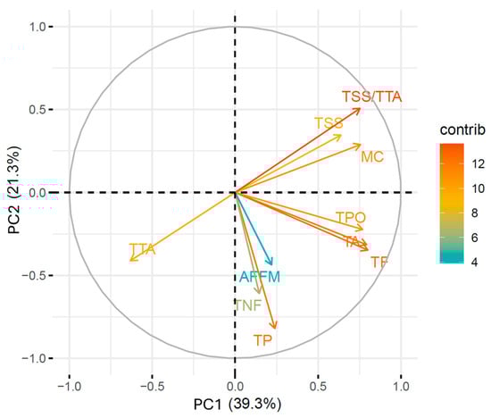 Principal component analysis with the percentage contribution of yield and quality attributes. MC: Mycorrhizal colonization; TSS: total soluble solids; TTA: total titratable acidity; TSS/TTA: fruit flavor; TA: total anthocyanin; TF: total flavonoid; TPO: total polyphenol; TNF: total number of fruits; TP: total production; AFFM: average fresh fruit mass.
