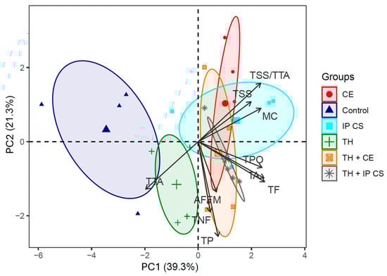 Principal component analysis (PCA) indicated that the first two principal components (PCs) accounted for 60.66% of the total variance (Figure 6). Attributes contributing most to PC1 included MC, TSS, TTA, TSS/TTA, TA, TF, and TPO (96.75%) (Table 5). For PC2, the attributes TSS/TTA, TP, and TNF contributed 60.96%. In PC3, the attributes TP, TNF, and AFFM represented 72.20% of the total variation (Table 5). PCA formed two groups, one of which included only the control (Figure 7). This treatment had fruits with the lowest total flavonoid and polyphenol content (Table 4). The second group was formed by the other five treatments containing biostimulants, either alone or in combination (Figure 7), which mainly corroborated the results of the total phytochemical content of the fruits (Table 4).