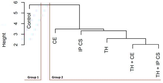 Dendrogram of the six treatments in strawberry plants of cv. ‘San Andreas’. TH: Trichoderma harzianum; CE: monospecies inoculant formed by Claroideoglomus etunicatum; IP CS: multispecies inoculant from cultivated soil (CS) collected in the municipality of Ipê (IP), RS, Brazil.