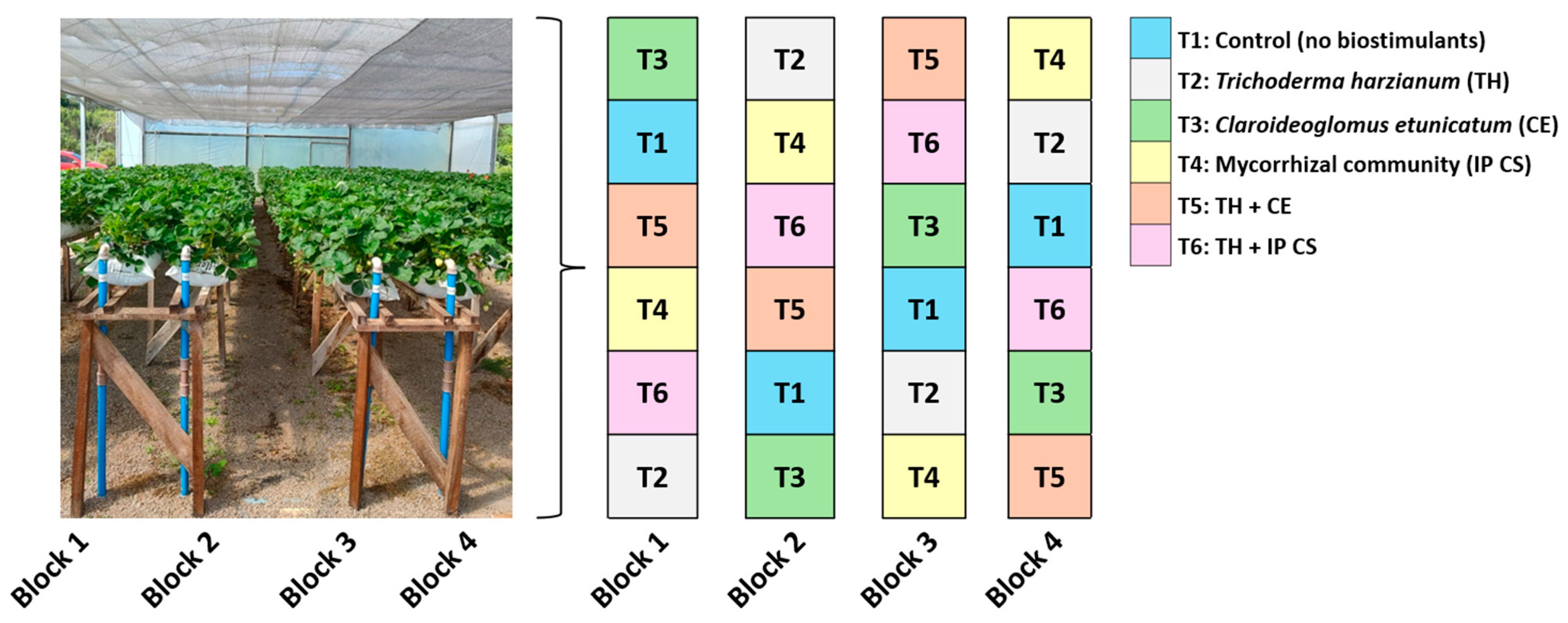 - Chiomento, J.L.T.; Fracaro, J.; Görgen, M.; Fante, R.; Dal Pizzol, E.; Welter, M.; Klein, A.P.; Trentin, T.S.; Suzana-Milan, C.S.; Palencia, P. Arbuscular mycorrhizal fungi, Ascophyllum nodosum, Trichoderma harzianum, and their combinations influence the phyllochron, phenology, and fruit quality of strawberry plants. Agronomy 2024, 14, 860. [Google Scholar] [CrossRef]