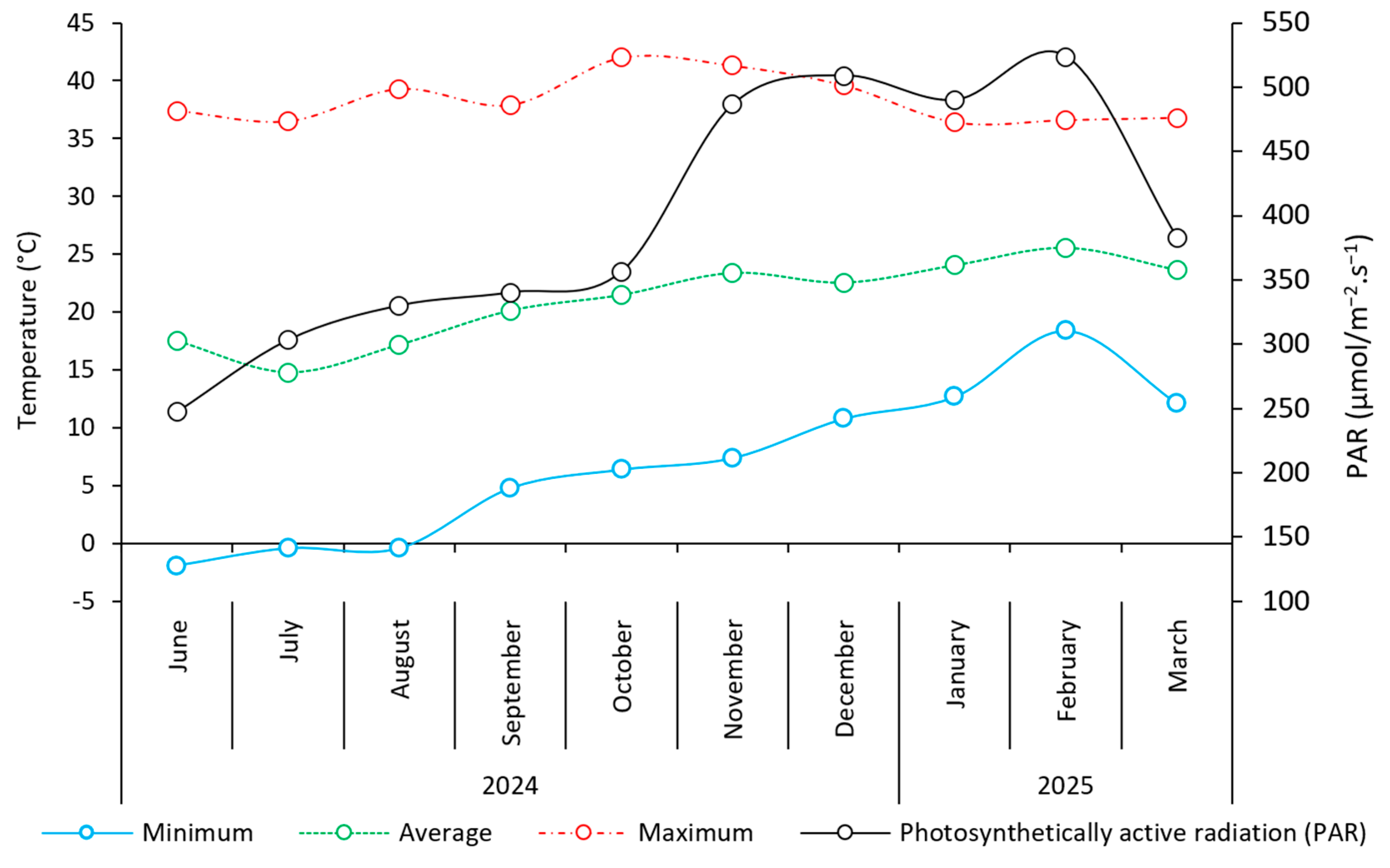 - Shirdel, M.; Eshghi, S.; Shahsavandi, F.; Fallahi, E. Arbuscular mycorrhiza inoculation mitigates the adverse effects of heat stress on yield and physiological responses in strawberry plants. Plant Physiol. Biochem. 2025, 221, 109629. [Google Scholar] [CrossRef] [PubMed]
