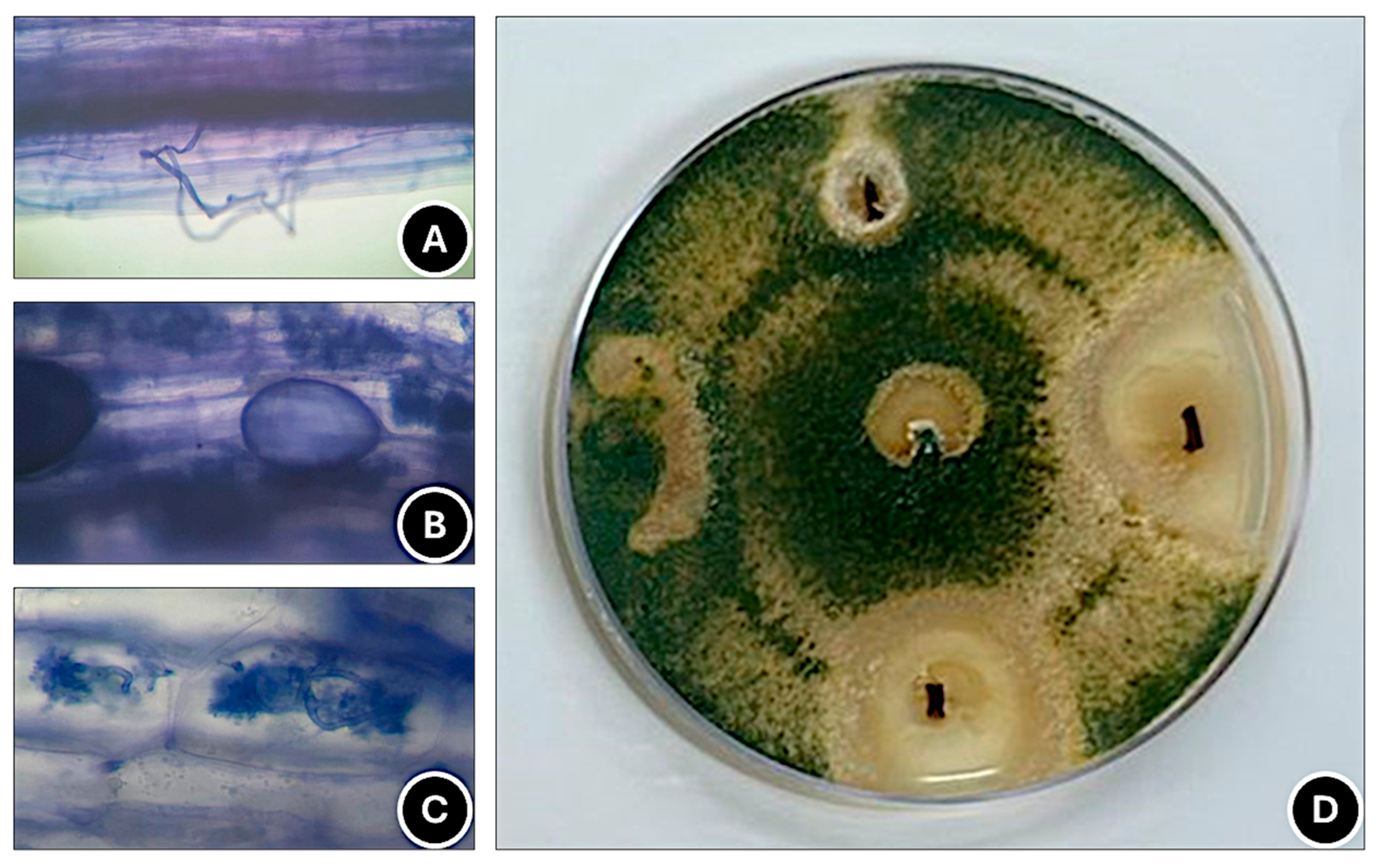 - Covacevich, F.; Fernandez-Gnecco, G.; Consolo, V.F.; Burges, P.L.; Calo, G.F.; Mondino, E.A. Combined soil inoculation with mycorrhizae and Trichoderma alleviates nematode-induced decline in mycorrhizal diversity. Diversity 2025, 17, 334. [Google Scholar] [CrossRef]
