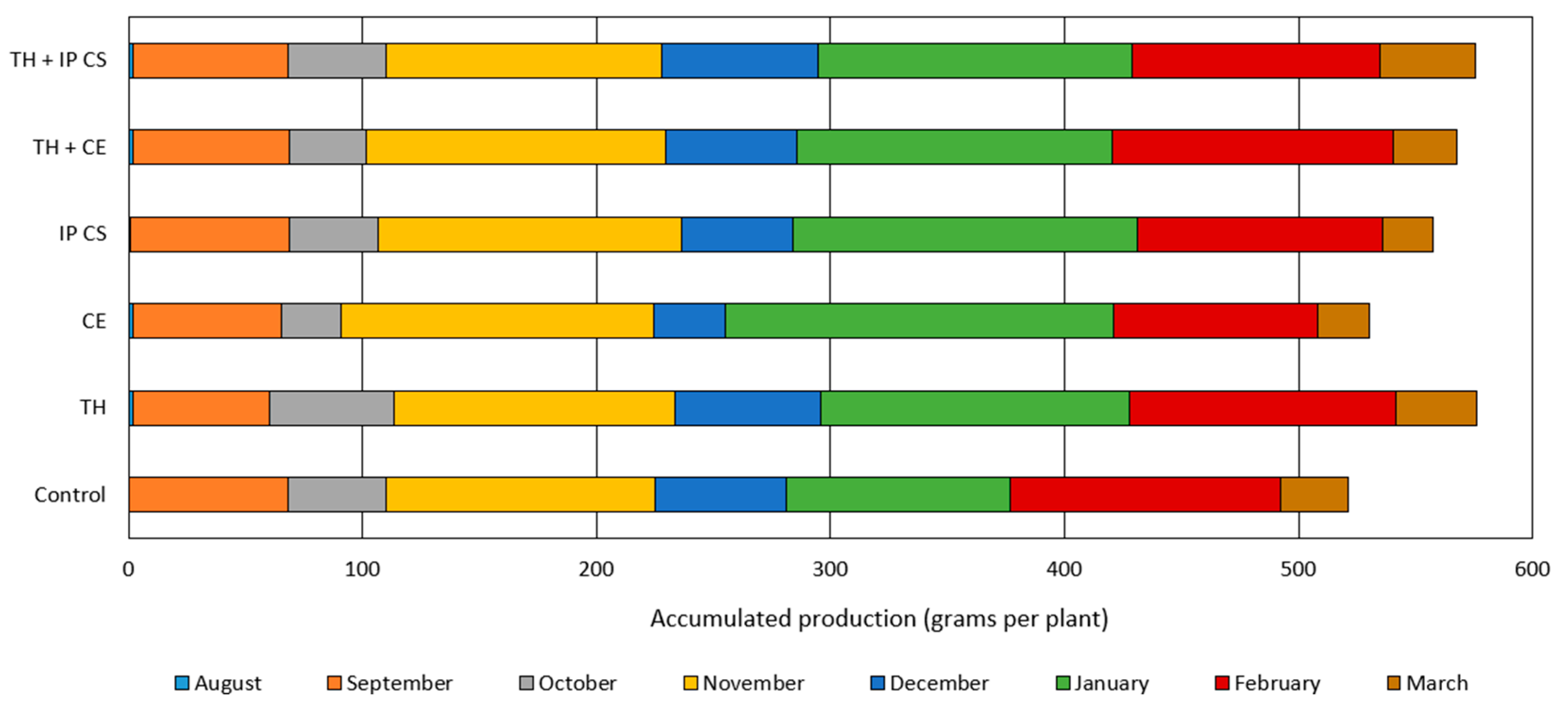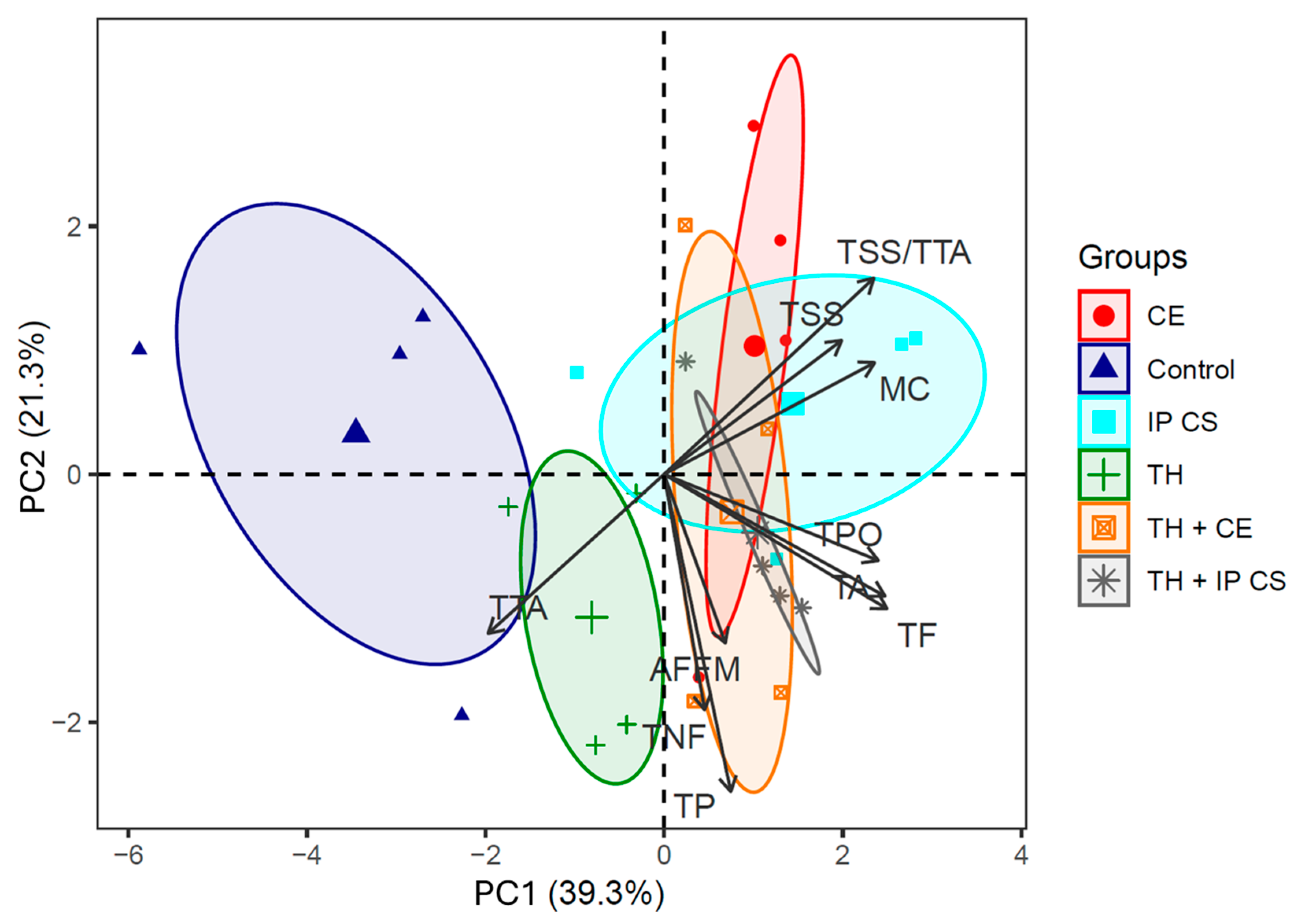 | TH + IP CS | 5.55 ± 0.31 ab | 7.20 ± 0.00 ab | 5.04 ± 0.10 ab | 121.21 ± 7.04 a | 1570.51 ± 79.21 a |