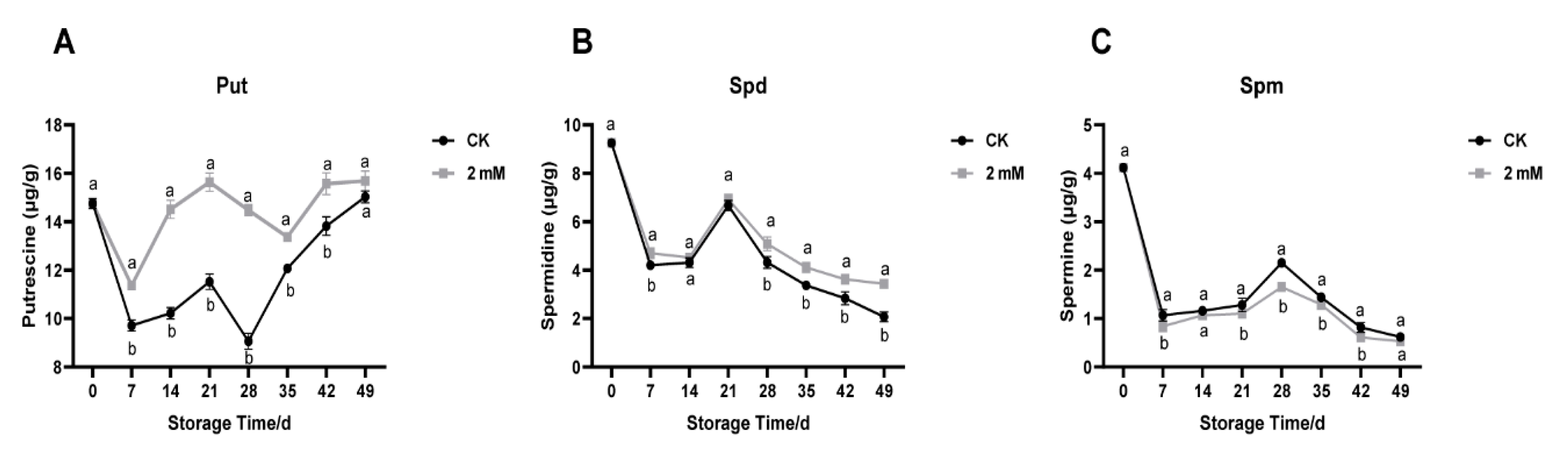 3.2. Temporal Changes in Endogenous Polyamine Levels in Stored Yellow Melon Fruit