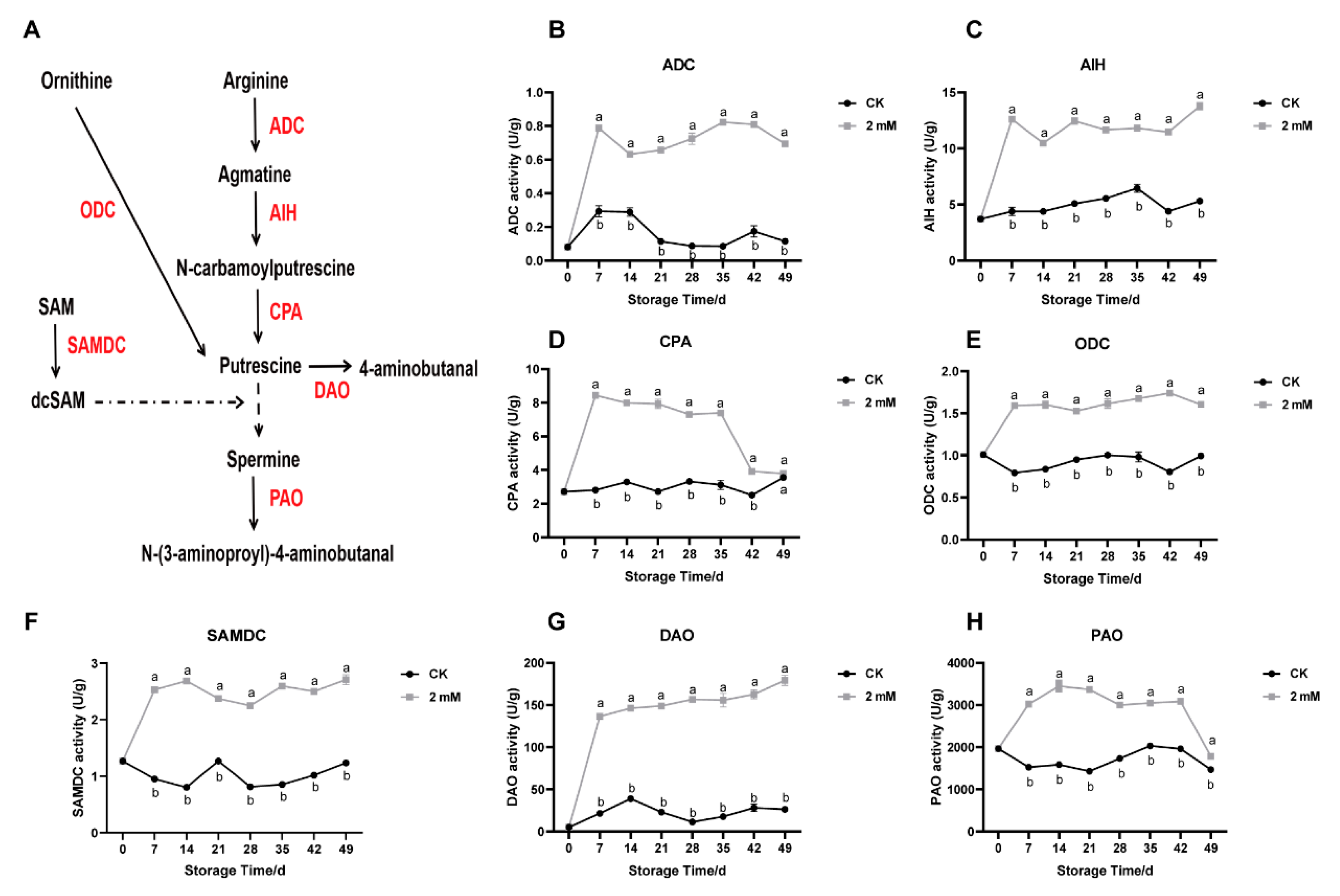 - Gao, C.; Sheteiwy, M.S.; Han, J.; Dong, Z.; Pan, R.; Guan, Y.; Alhaj Hamoud, Y.; Hu, J. Polyamine biosynthetic pathways and their relation with the cold tolerance of maize (Zea mays L.) seedlings. Plant Signal. Behav. 2020, 15, 1807722. [Google Scholar] [CrossRef]
