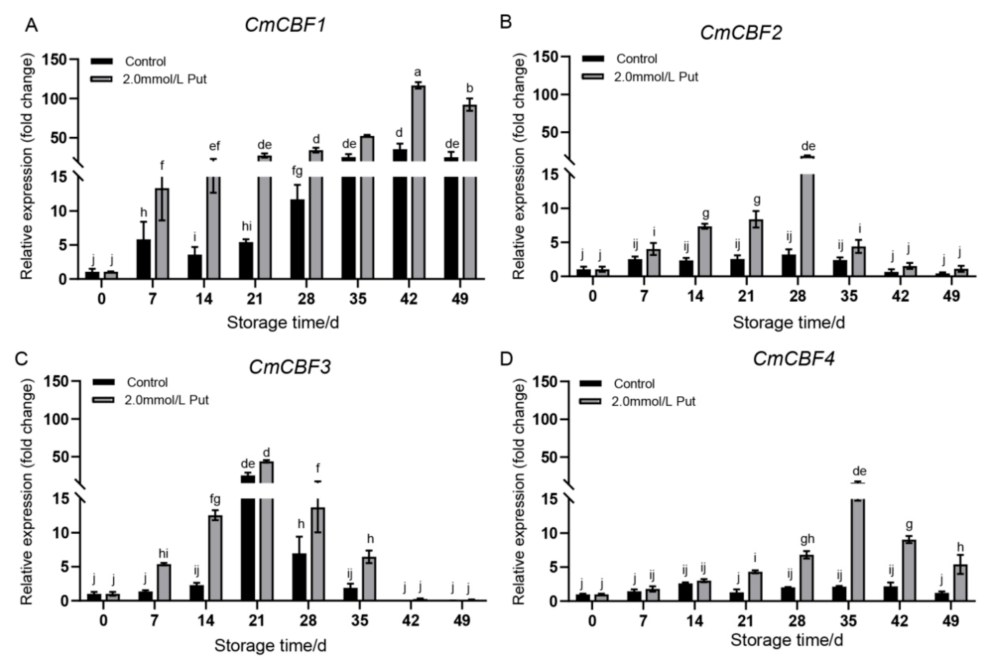 3.5. Expression of CmCBFs in Put-Treated Yellow Melon During Cold Storage