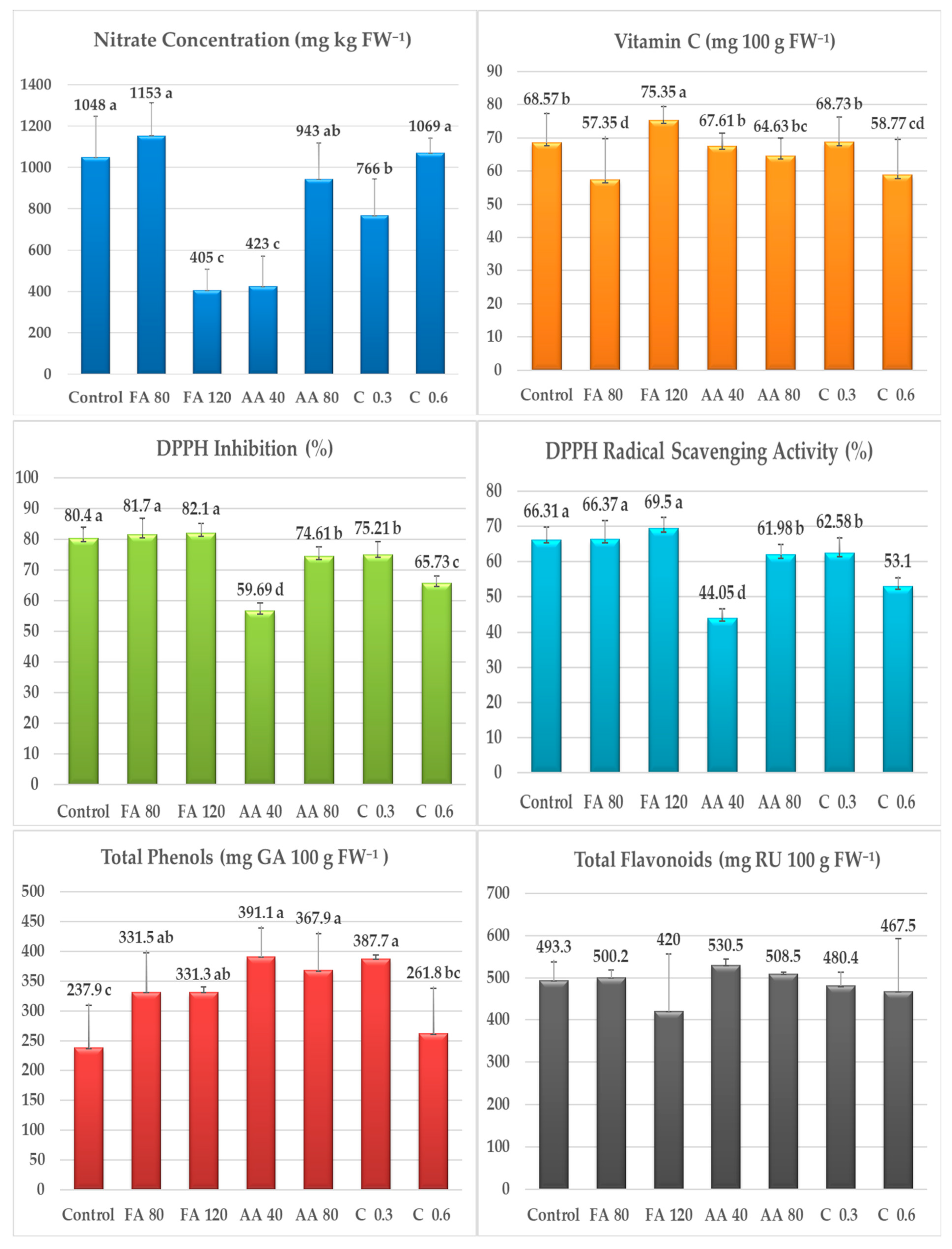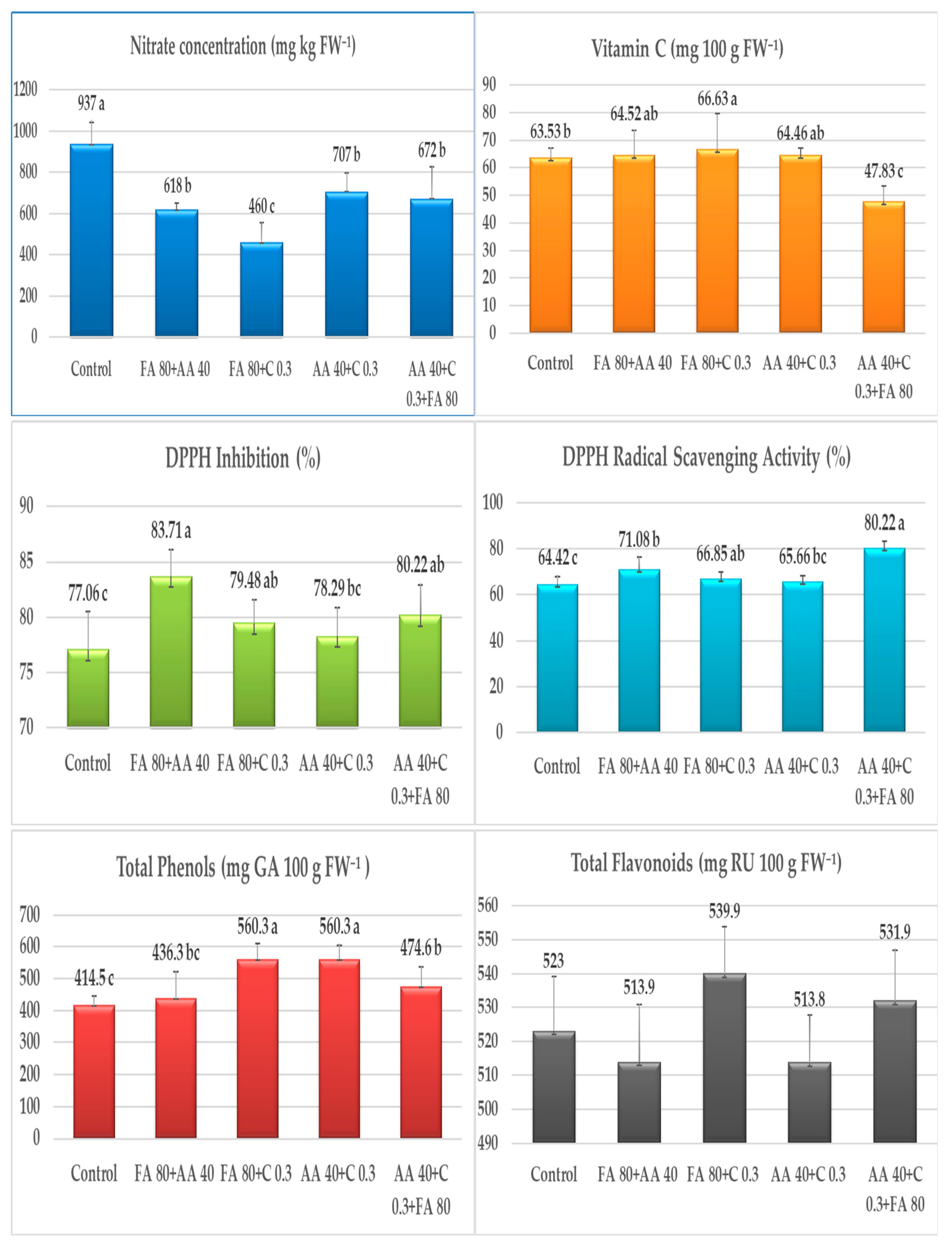 12] reported that the application of FA alone did not significantly reduce nitrate content in lettuce. Similarly, İkiz et al. [