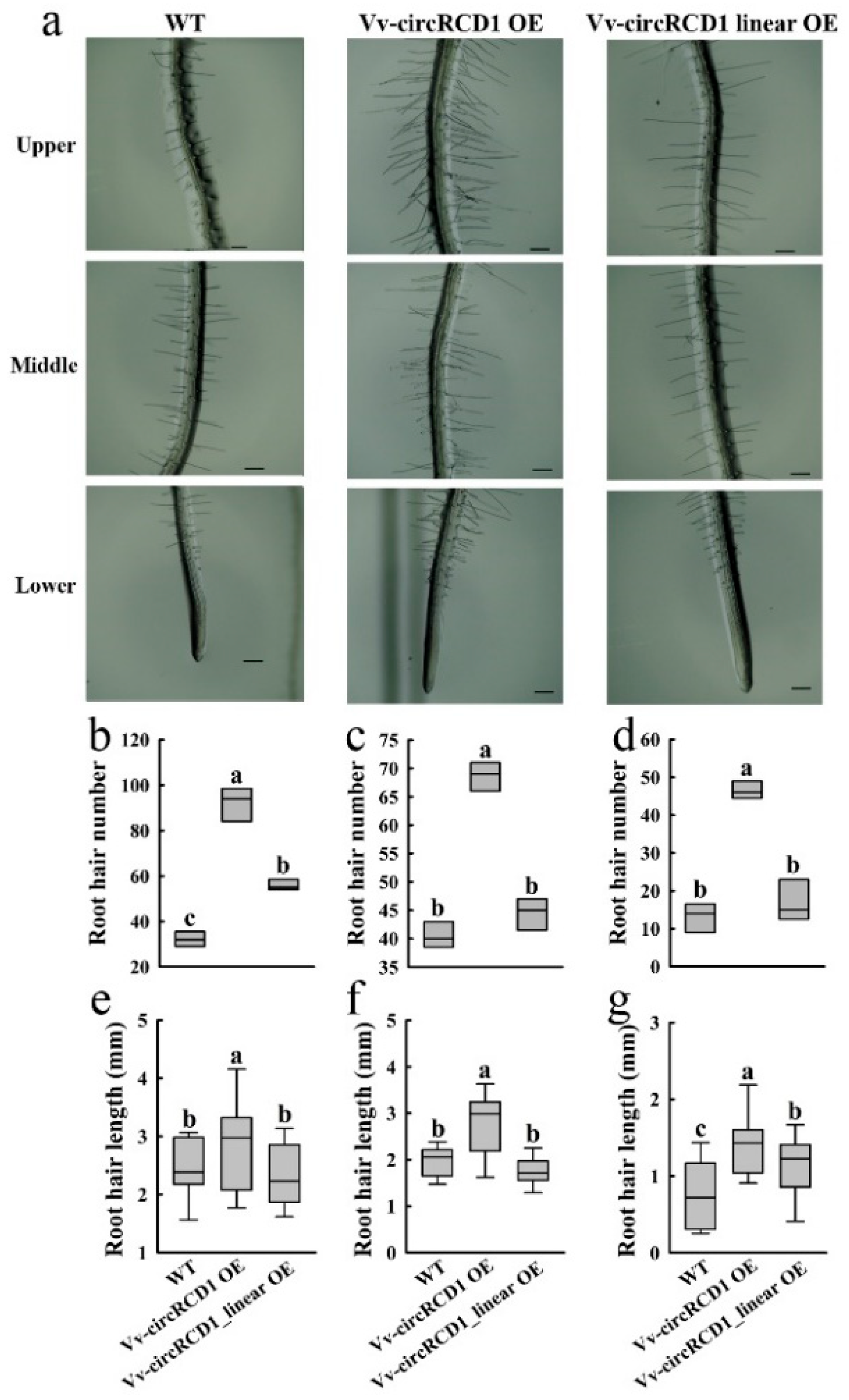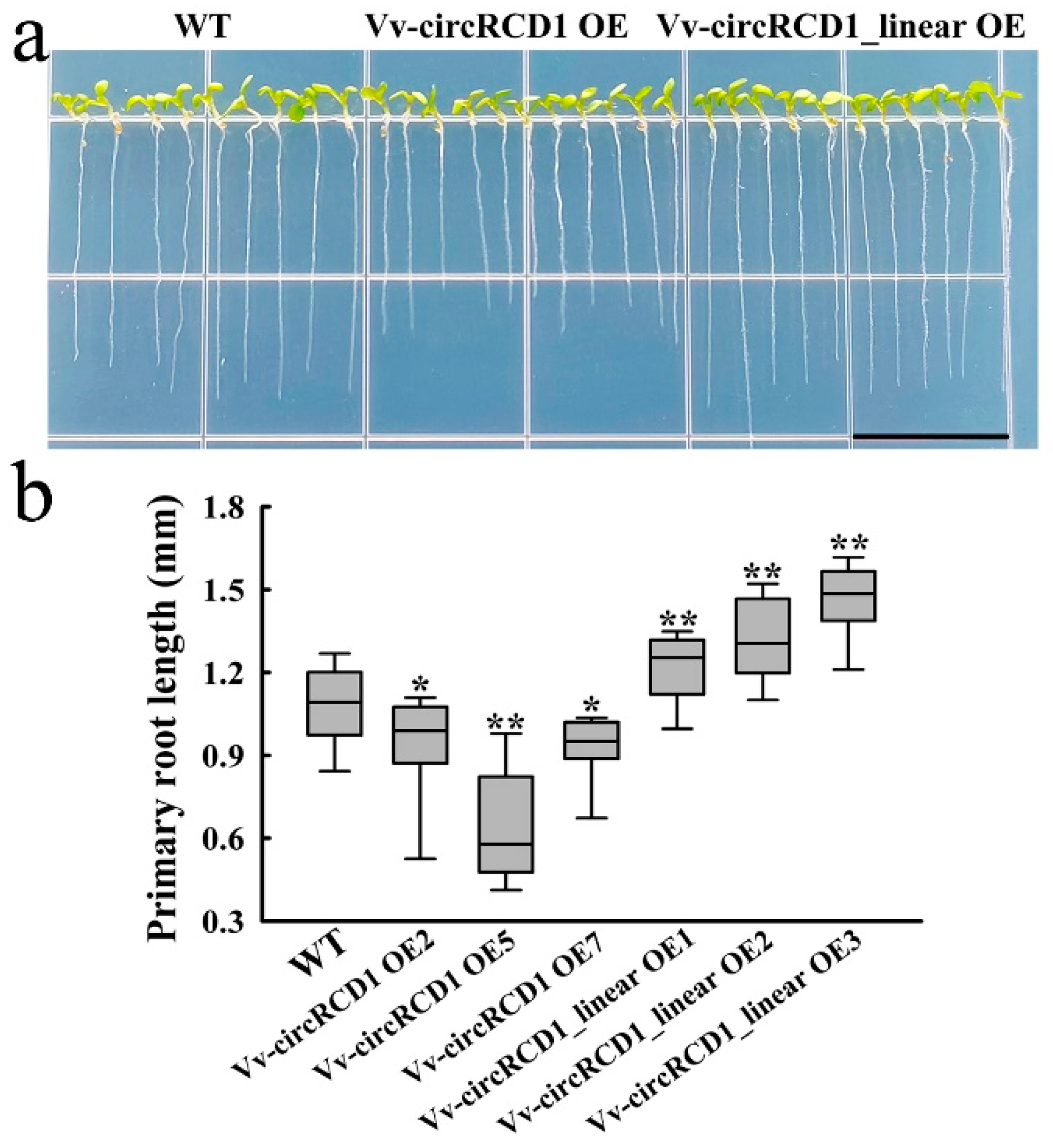 4.2. Grapevine Vv-circRCD1 Alters Root Phenotypes in Arabidopsis