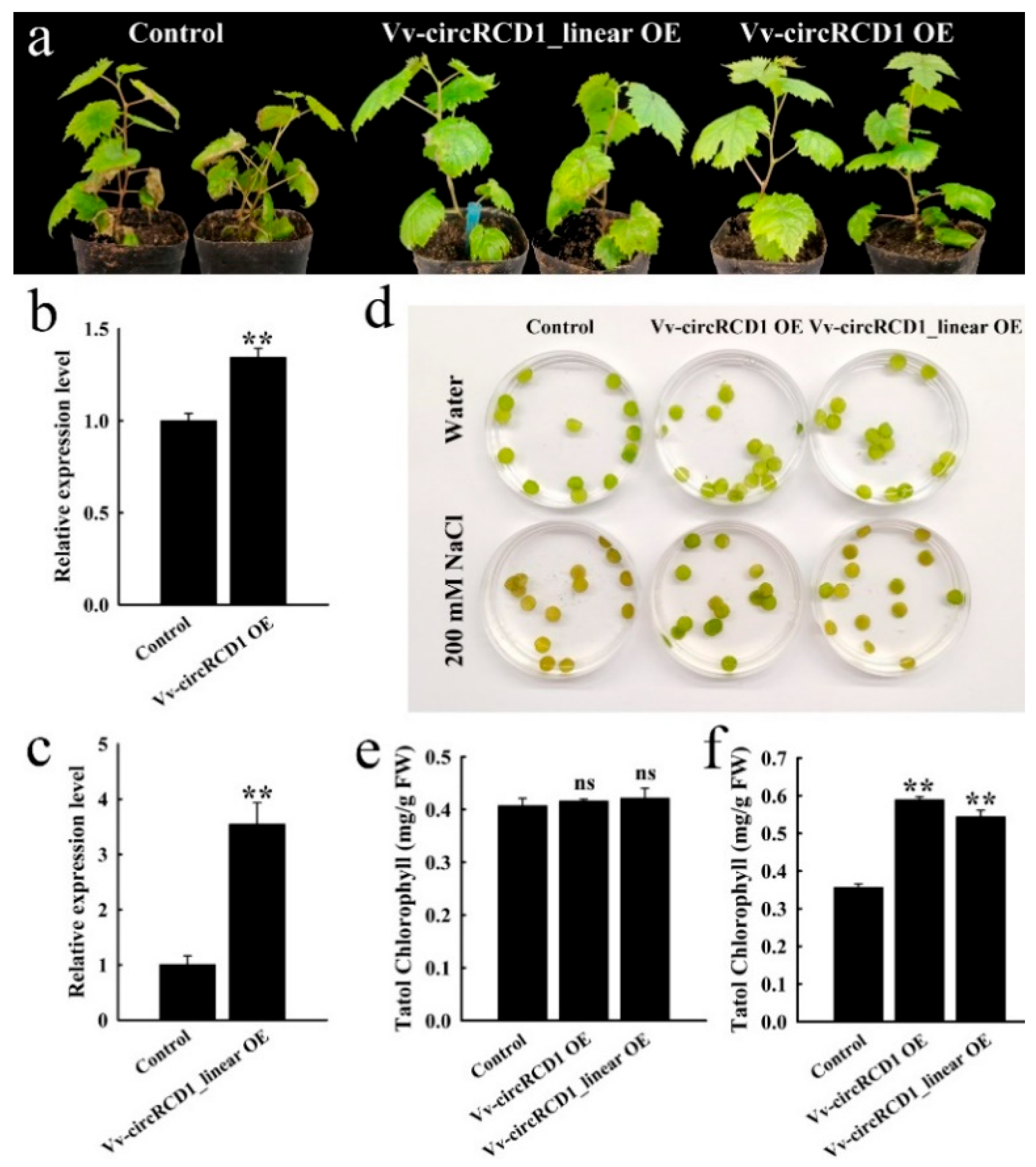 - Ren, Y.; Li, J.; Liu, J.; Zhang, Z.; Song, Y.; Fan, D.; Liu, M.; Zhang, L.; Xu, Y.; Guo, D.; et al. Functional differences of grapevine circular RNA Vv-circPTCD1 in Arabidopsis and grapevine callus under abiotic stress. Plants 2023, 12, 2332. [Google Scholar] [CrossRef]