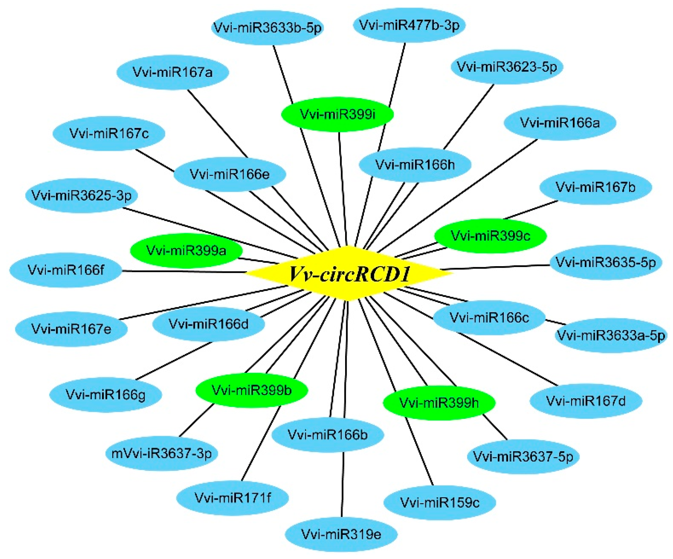 3.5. Interaction Network Between Grapevine Vv-circRCD1 and miRNAs