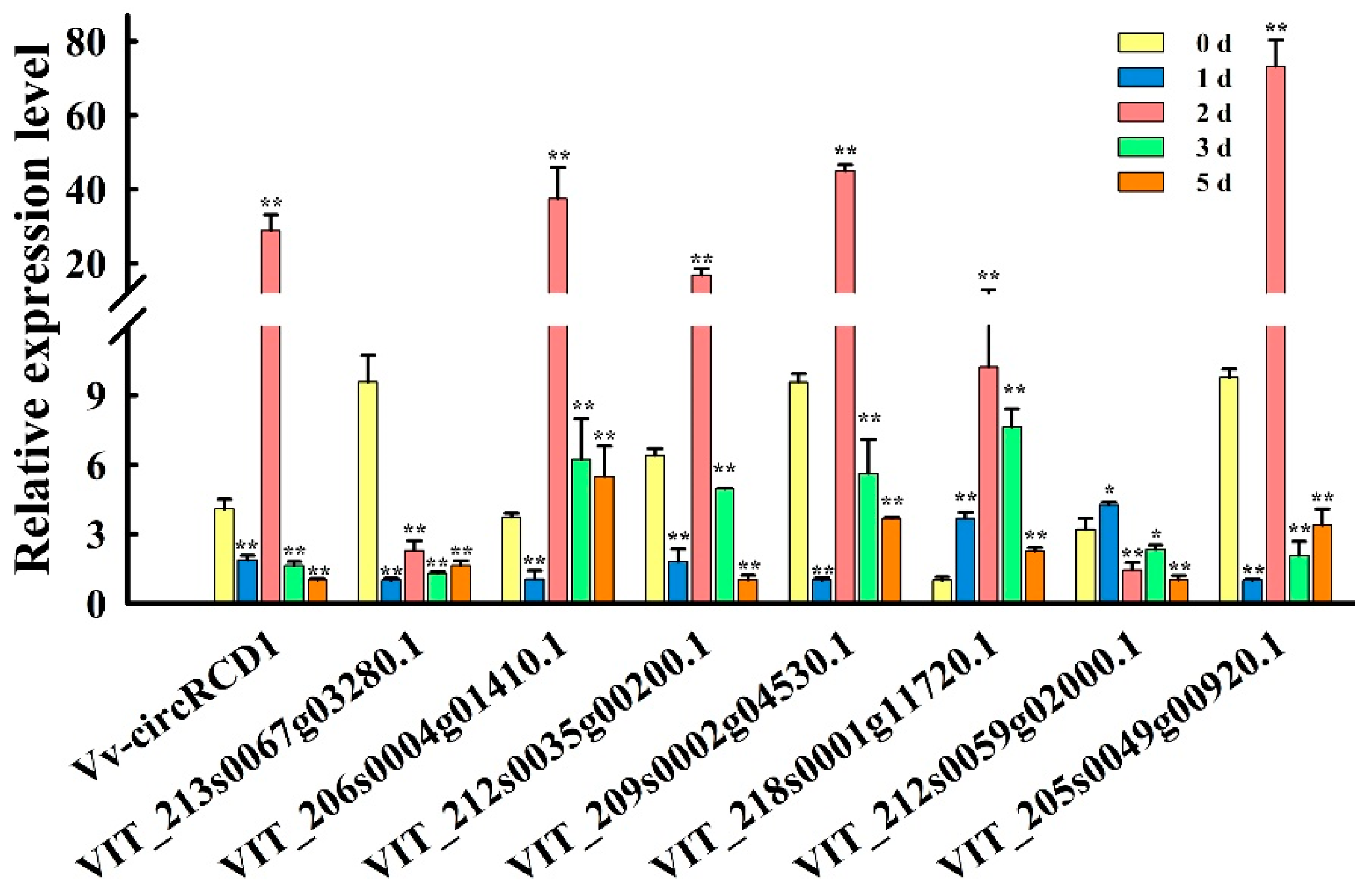 - Gao, Z.; Li, J.; Luo, M.; Li, H.; Chen, Q.; Wang, L.; Song, S.; Zhao, L.; Xu, W.; Zhang, C.; et al. Characterization and cloning of grape circular RNAs identified the cold resistance-related Vv-circATS1. Plant Physiol. 2019, 180, 966–985. [Google Scholar] [CrossRef] [PubMed]