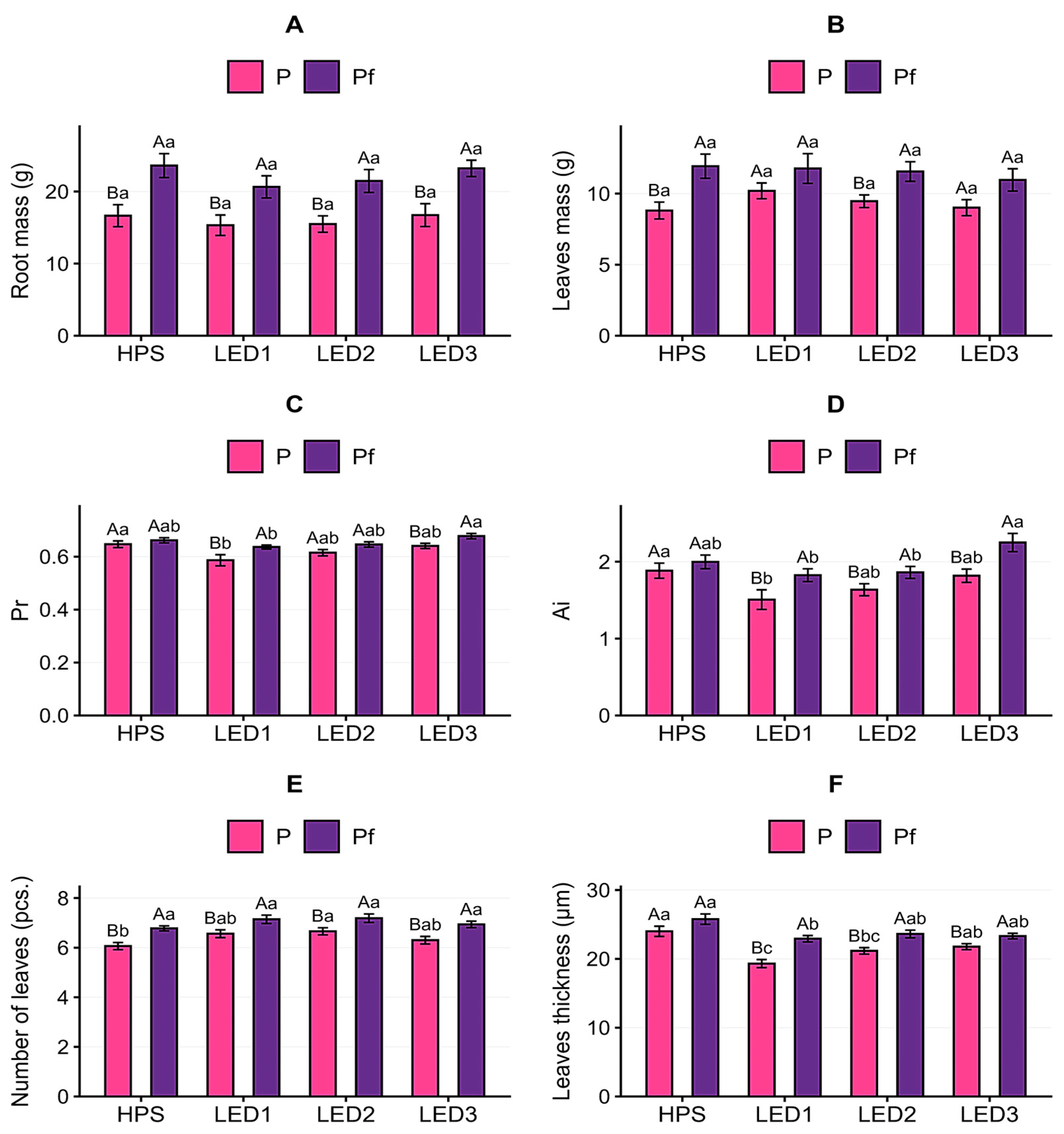 | Far-red (F-R) | 701–750 | Pf | 40.7 ± 0.3 Bd | 47.6 ± 0.3 Bc | 50.9 ± 0.3 Bb | 52.9 ± 0.4 Aa |