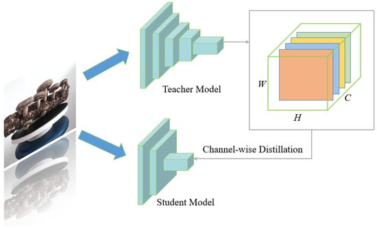 Knowledge Distillation (KD) is a model compression and optimization technique that enables smaller student models to learn knowledge from complex teacher models, thereby reducing model size or improving efficiency while ensuring performance. Proposed by Hinton et al. [40] in 2015, this method is an important extension of supervised learning. Channel-wise Knowledge Distillation (CWD) is further improved based on this, with its core idea being to guide the student model to learn the information distribution of the teacher model across feature channels, enhancing the representational capacity of lightweight models. As shown in Figure 11, the input image generates feature maps with dimensions (C × H × W) through the teacher model, which is the improved YOLOv8l, while the improved YOLOv8n serves as the student model. Traditional distillation methods mostly impose constraints on the overall feature map or pixel space, which easily leads to insufficient local feature learning. In contrast, CWD is applied to the multi-scale feature maps (P3, P4, and P5) in the neck network, which are crucial for mushroom maturity detection at different spatial scales.