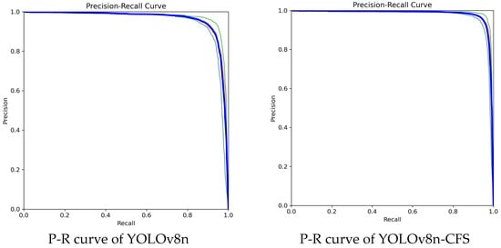 Figure 14 presents the Precision–Recall (P-R) curves of the baseline model and the improved model. As observed from the figure, the P-R curve of YOLOv8n-CFS is overall closer to the top-right corner: under the same Recall, its Precision is higher than that of YOLOv8n; under the same Precision, it covers a wider range of Recall. The increase in the Area Under the Curve (AUC) further verifies the optimization of the model’s comprehensive performance. In the high Recall interval (e.g., 0.8–1.0), the Precision of YOLOv8n-CFS shows a gentler downward trend, indicating that the improved model has stronger detection capability for hard samples. It effectively reduces the missed detection risk of unripe small mushroom buds, exhibits better performance at the balance point between Precision and Recall, and the improved algorithm has more reasonable selection of key thresholds.