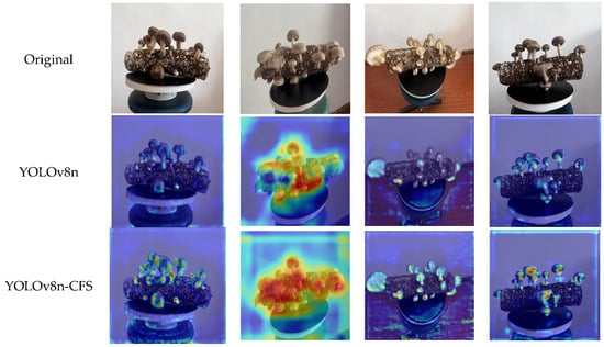 The heatmaps before and after improvement were compared. As shown in Figure 16, heatmaps of Lentinula edodes detection from four different angles are presented. YOLOv8n-CFS more accurately focuses on the key regions of Lentinula edodes in the detection task. The heatmaps generated by the original YOLOv8n model exhibit omissions or uneven attention distribution in some images, while the YOLOv8n-CFS method demonstrates more stable and clear detection capability. It shows more uniform and precise attention to the target regions of Lentinula edodes, with the attention areas in some heatmaps being more concentrated on the mushroom body. The improved method enhances the accuracy of target detection.