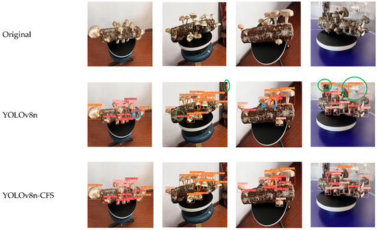 Comparative Diagram of Detection Results between YOLO v8n and YOLOv8n-CFS (blue circles indicate missed detections; green circles indicate false detections).