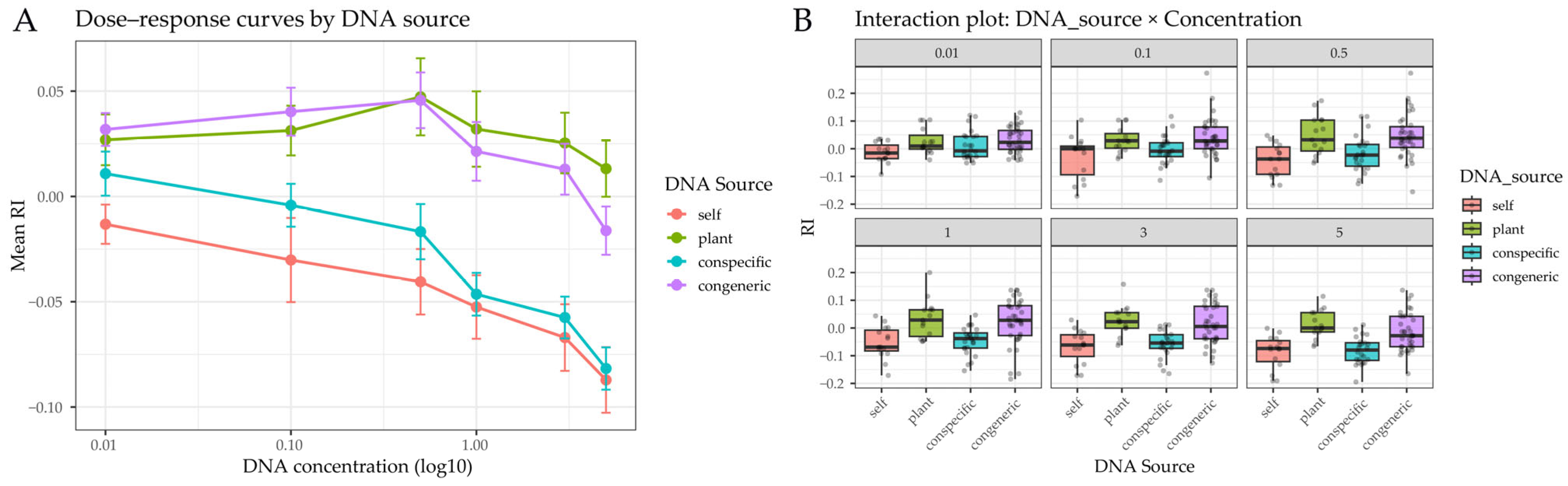 3.2. Factorial Analysis of DNA Source and Concentration Effects