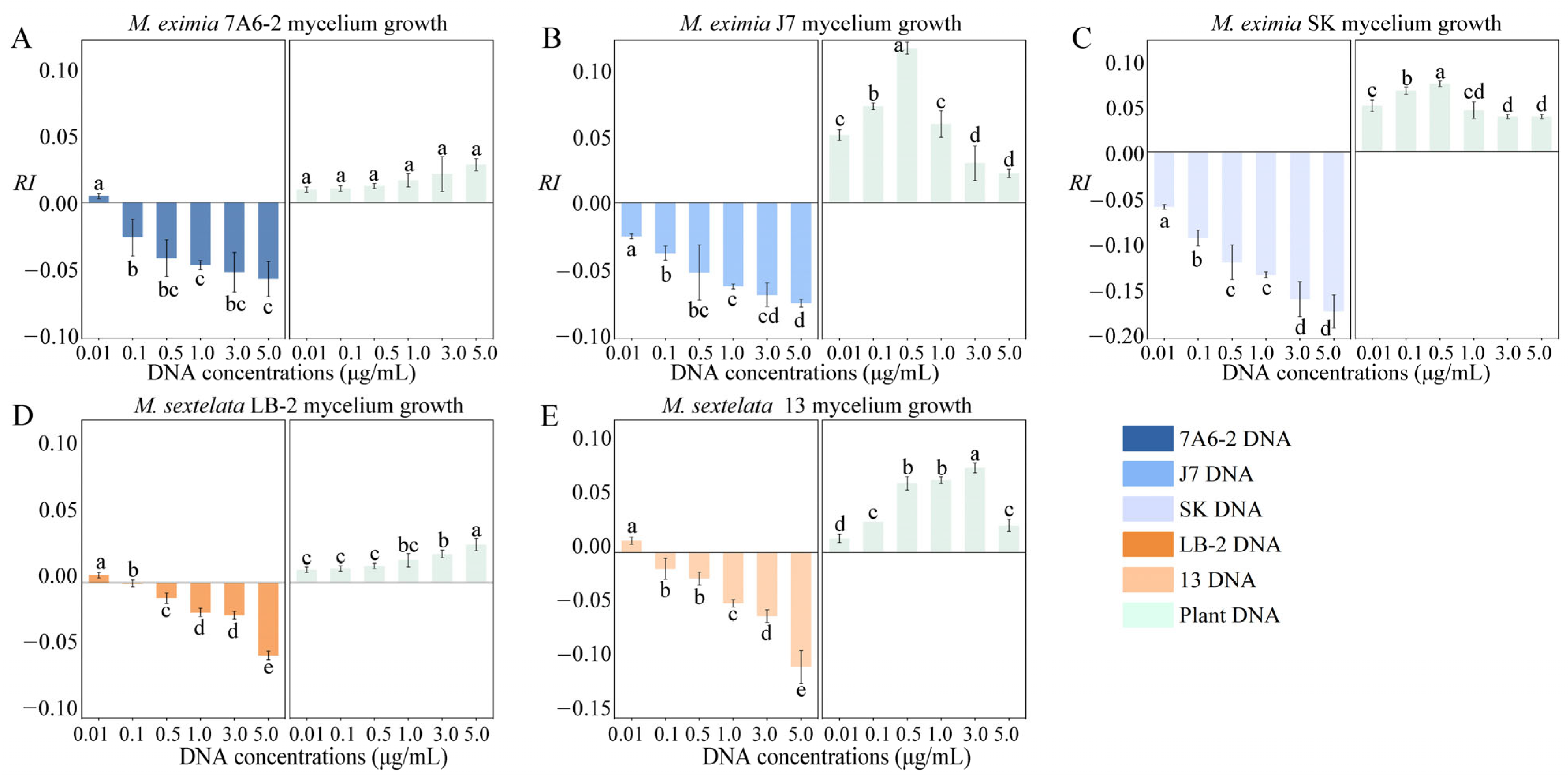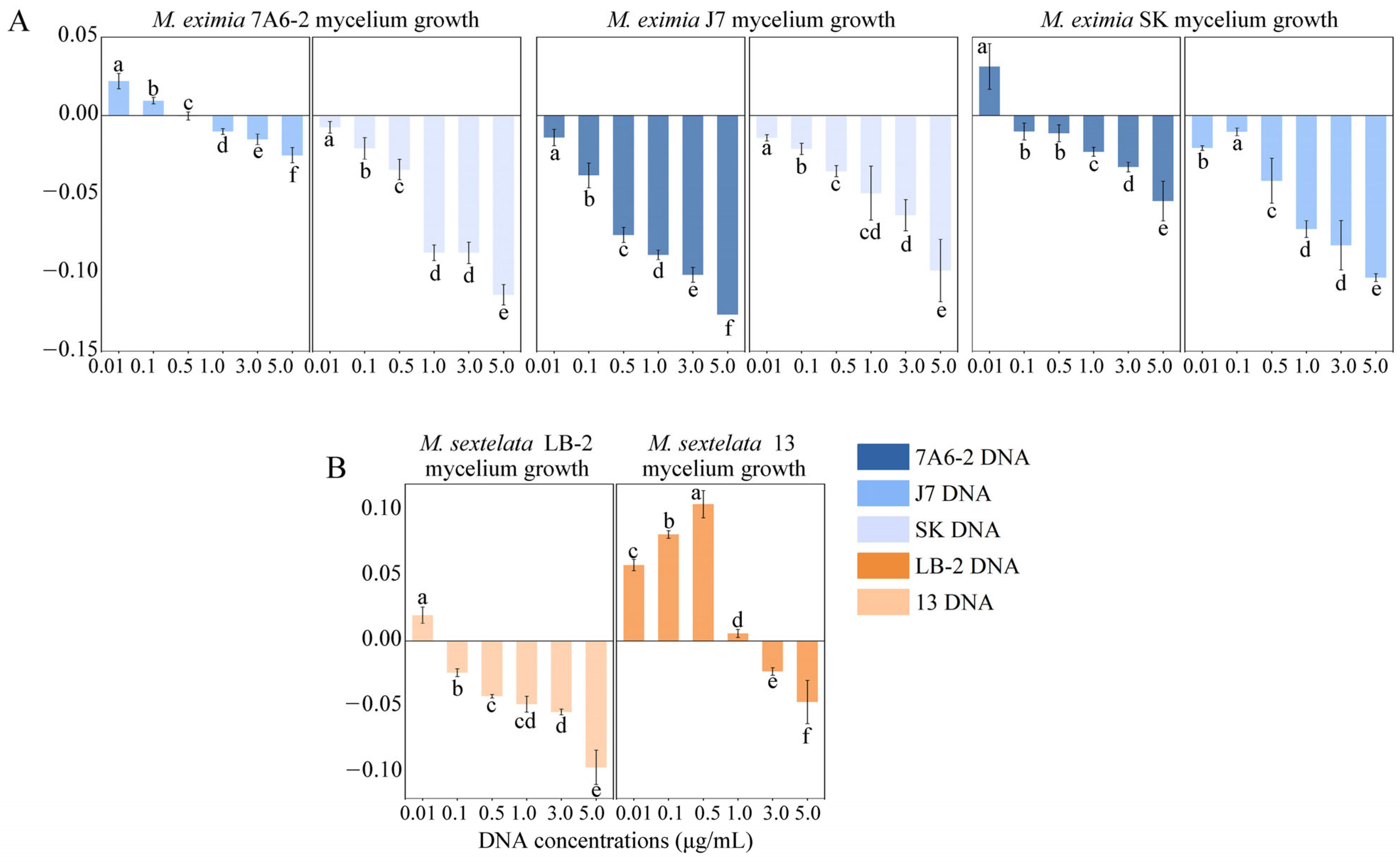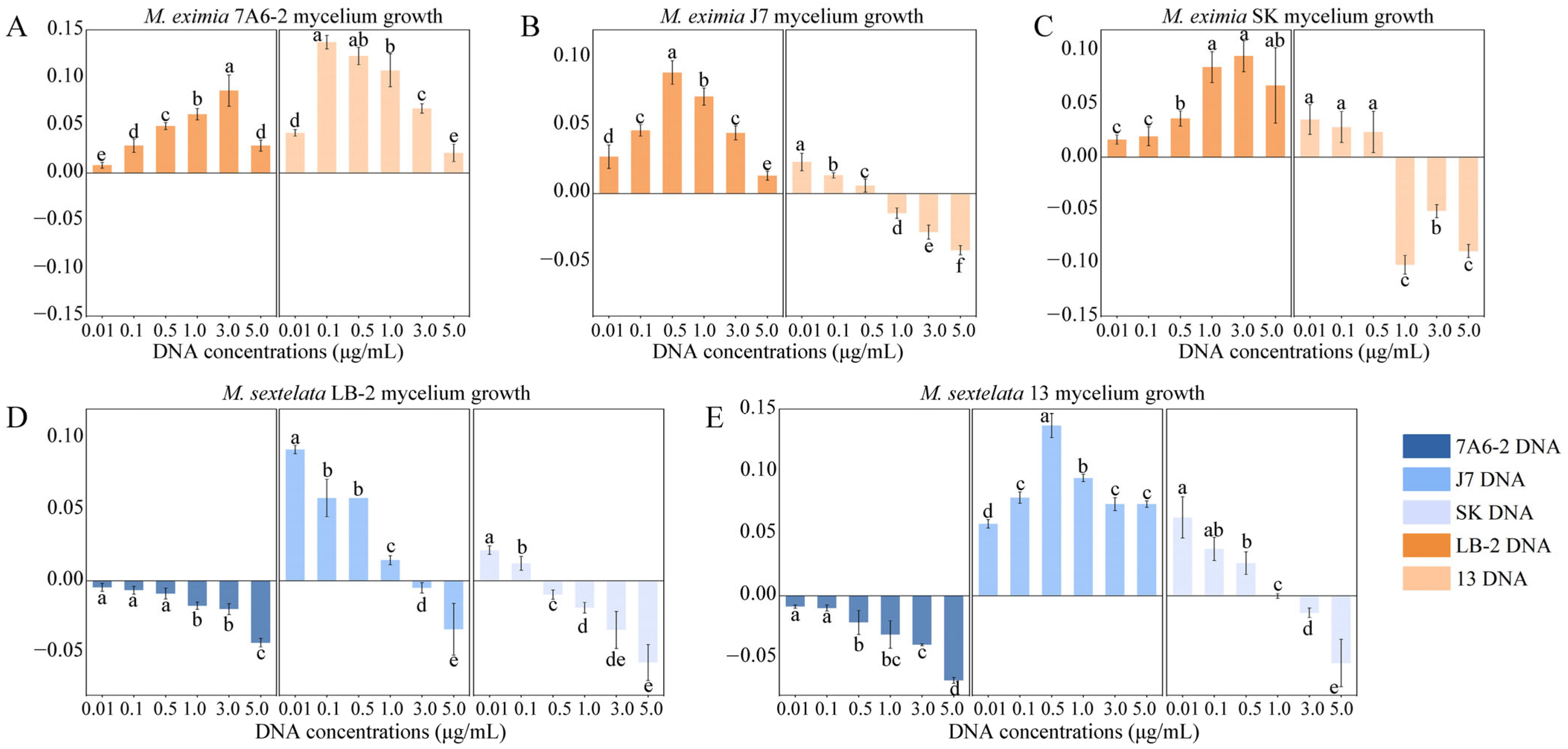 3.5. Effect of Congeneric ExDNA on Mycelial Growth Morchella spp.