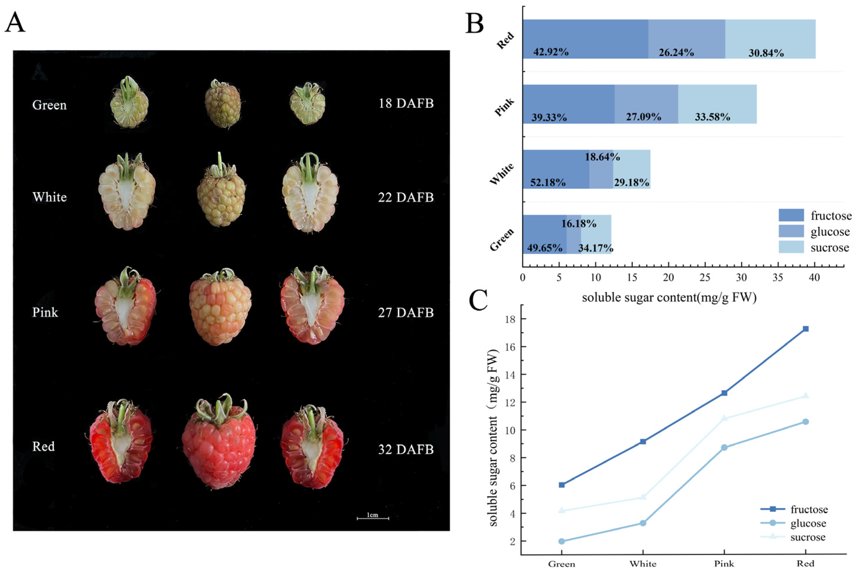 3.1. Variation in Soluble Sugar Content During Raspberry Fruit Ripening Stages