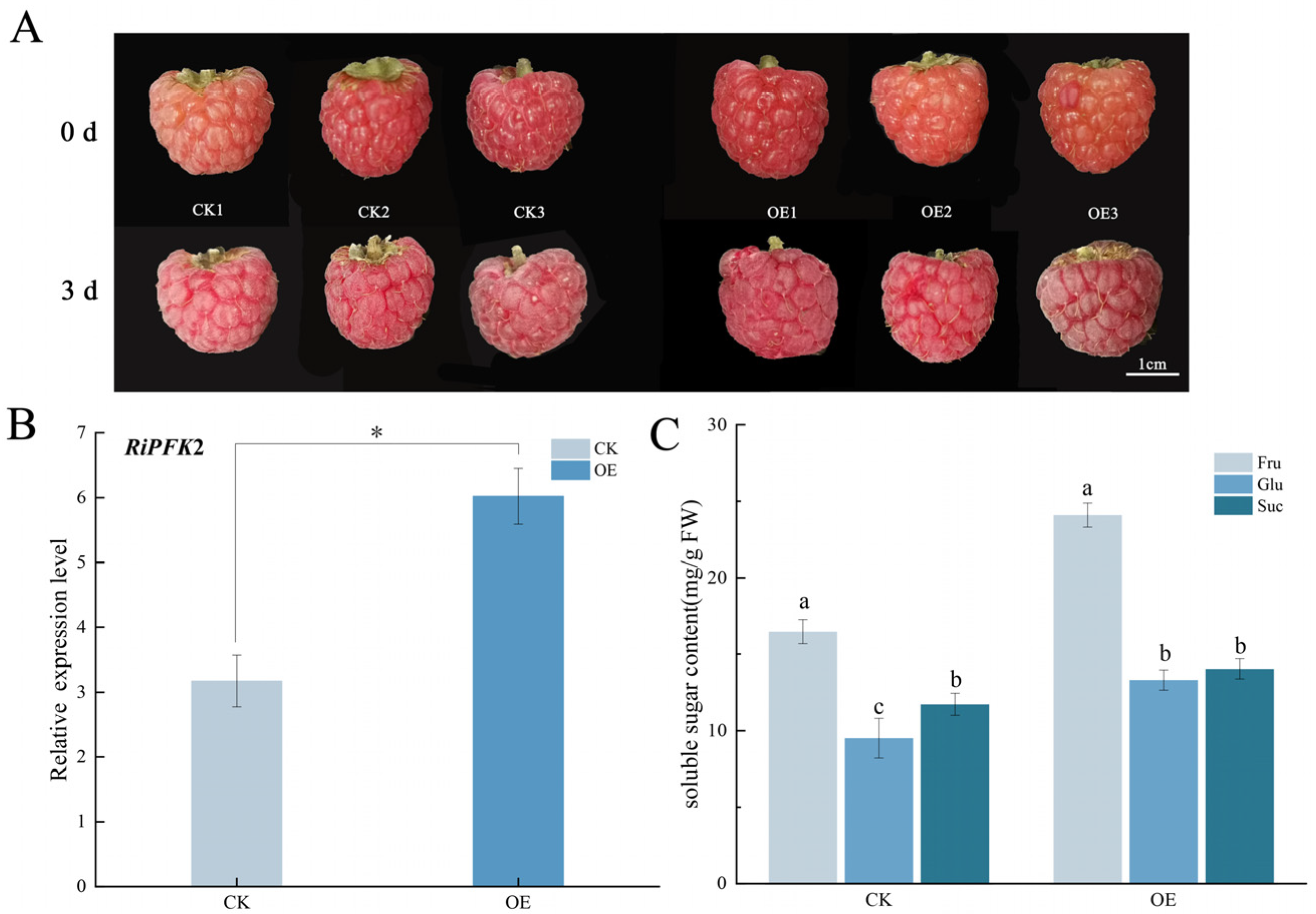 APA StyleXu, B., Zhang, T., Ling, X., Yang, F., Wen, Y., Yang, G., & Li, T. (2026). Functional Identification of the RiPFK2 Gene in Raspberry (Rubus idaeus L.) Demonstrates That It Enhances Fructose Content Inside Fruits. Horticulturae, 12(1), 79. https://doi.org/10.3390/horticulturae12010079