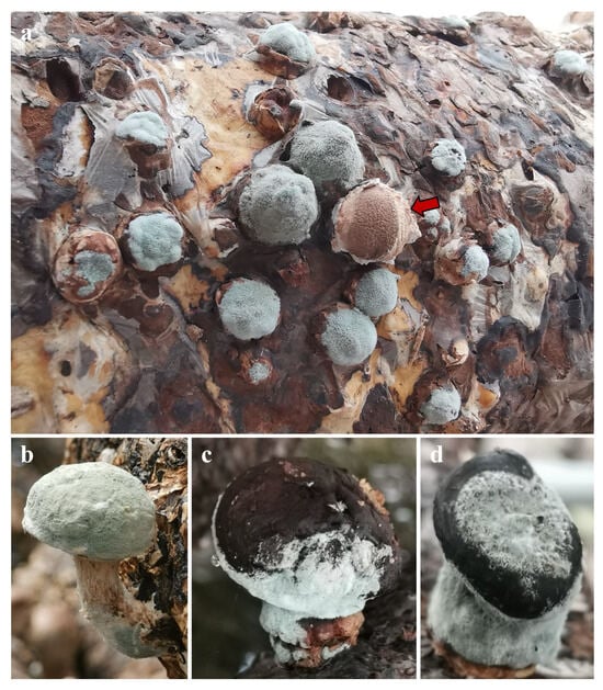 During the April–June fruiting period of L. edodes cultivation in Xixia County, greenhouses are typically managed at a mean air temperature of approximately 15–22 °C and a relative humidity of 80–90%; humidity is often held at 85–90% during primordium formation and reduced to 75–85% during cap expansion, with additional shading to keep peak June temperatures below 28 °C. Disease incidence ranged from 35% to 40%. The mean DSI (%) values across survey plots ranged from 21% to 38%, indicating moderate to severe disease pressure. Early symptoms consisted of small, light blue patches on pilei and stipes. Within days, lesions expanded and coalesced, with prolific blue conidiation and powdery masses covering affected surfaces (Figure 1). Progressive colonization led to tissue softening, water soaking, and secondary darkening culminating in black rot (Figure 1d). Symptomatic fruiting bodies rapidly lost marketability.