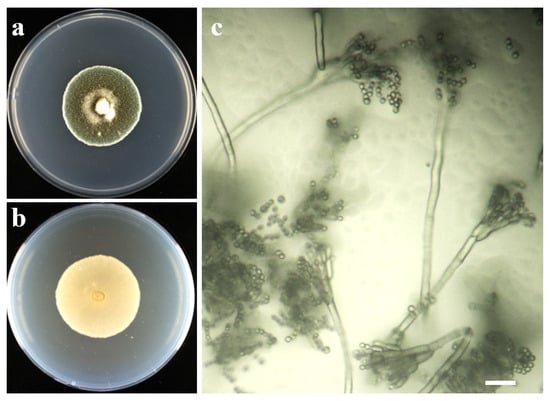 Morphology of the causal Penicillium sp. of isolate LE06. (a) colony on PDA, obverse, 7 d at 25 °C; (b) reverse on PDA; (c) conidiophores with ampulliform to subcylindrical phialides; smooth-walled, globose conidia in chains. Scale bar = 20 μm.