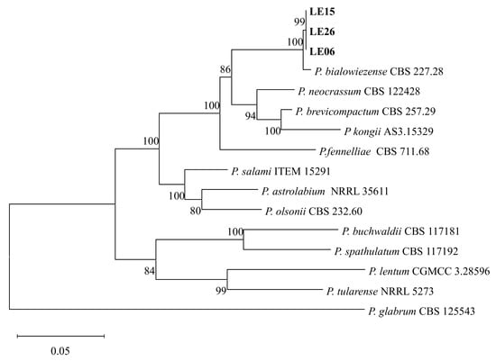 Pairwise BLASTn (version 2.17.0) searches supported assignment of all three isolates to P. bialowiezense (Table 3). For isolate LE06, ITS (PP908489) and rpb2 (PP919460) were 100% identical to P. bialowiezense CBS 227.28 (516/516 bp) and strain 5306 (846/846 bp), respectively, while benA (PP963648) and CaM (PP960544) showed 99% identity to KBP:F-430 (429/430 bp) and AS3.15316 (398/399 bp). Collectively, the multilocus identities (ITS 100%; benA/CaM 99–100%; rpb2 98–100%) unequivocally place LE06, LE15, and LE26 within P. bialowiezense.