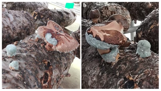 Pathogenicity test on shiitake cultivation bags (Koch’s postulates). (a,b) Cultivation bags sprayed to runoff with a conidial suspension developed diffuse blue colonies on fruiting bodies.